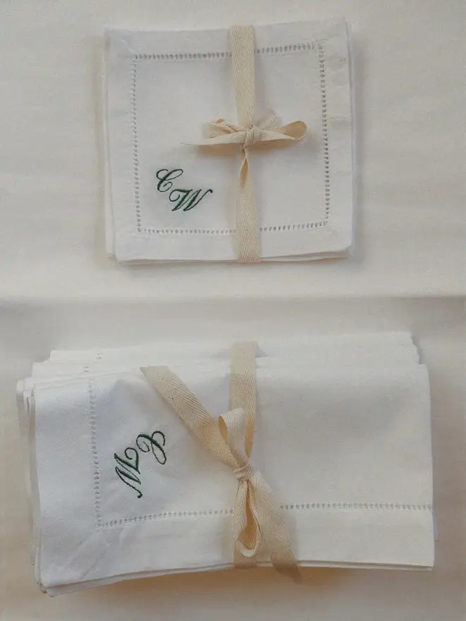 Crafted from impeccable linen and embroidered to one’s liking, this coaster ensures your table remains unblemished and your standards unchallenged. A charming detail for those who wouldn’t dream of placing a drink directly on wood.