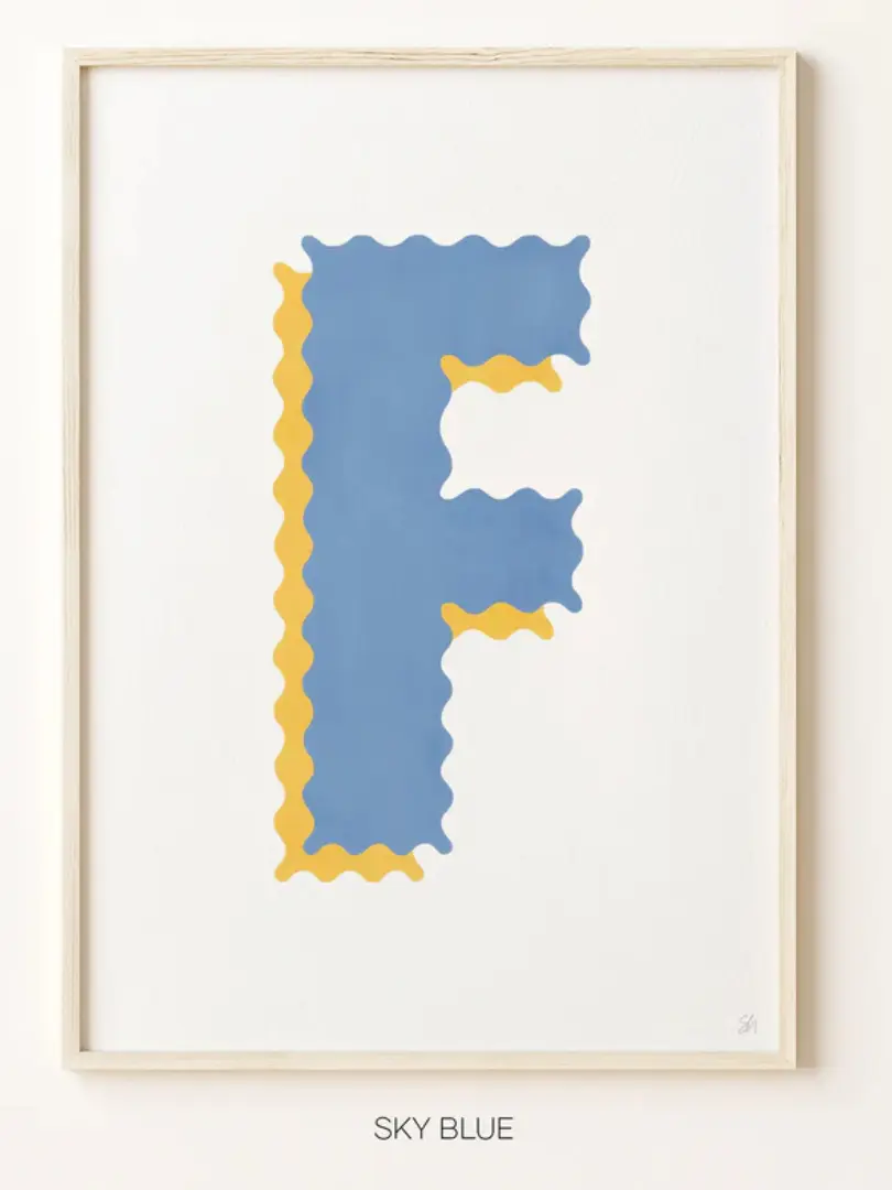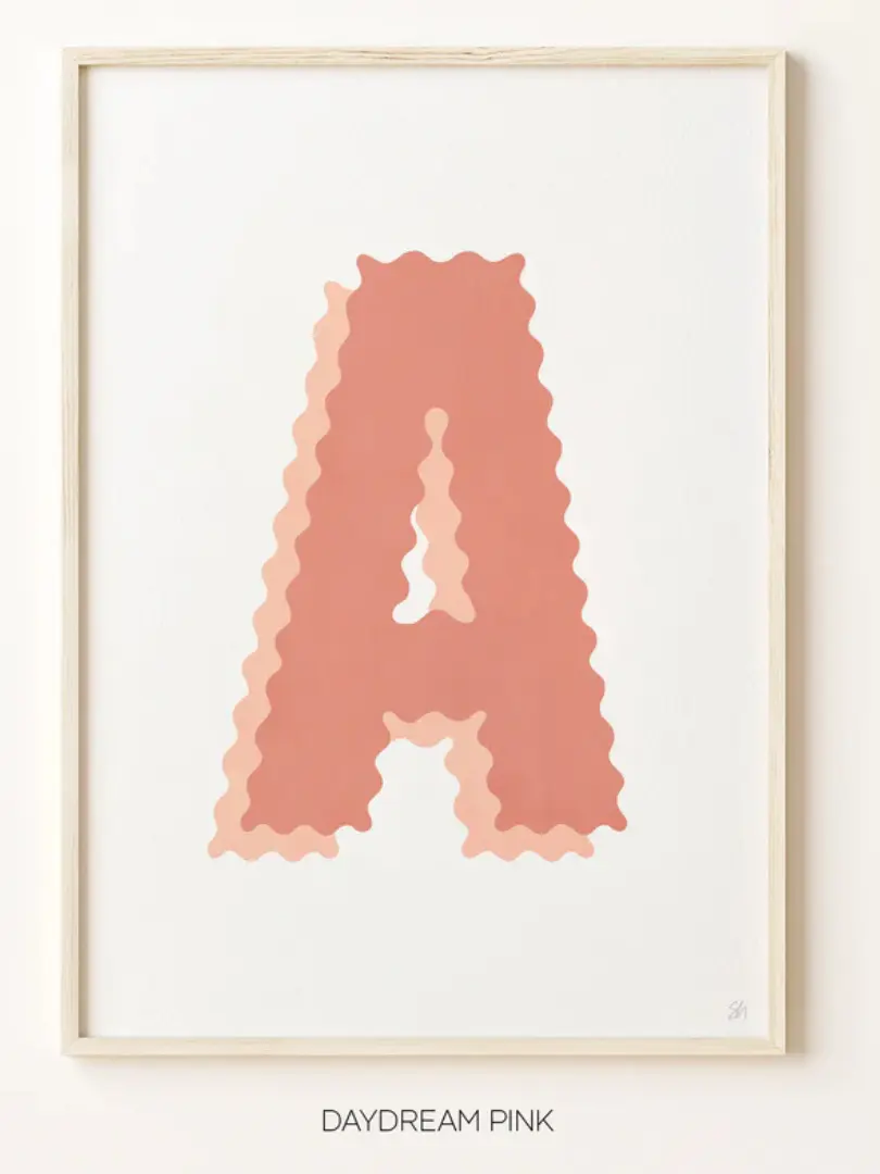 A playful take on typography, hand-drawn and printed as a fine art Giclee print in A4 or A3 size. Select your colour choice and letter from the list.