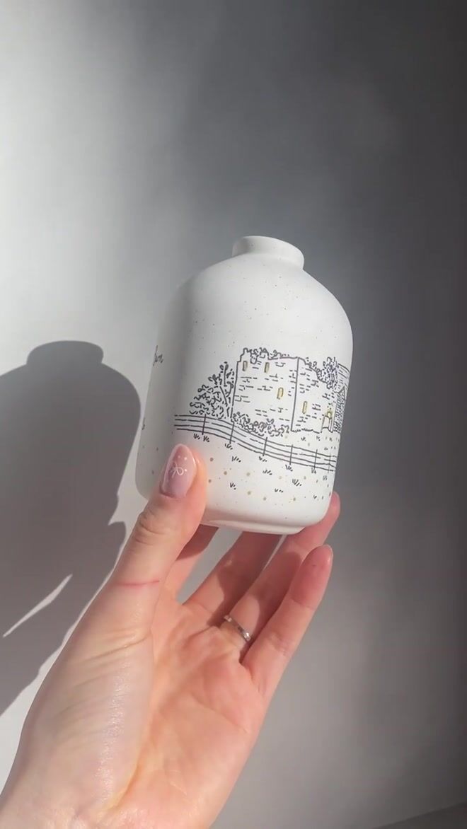 This hand drawn keepsake vase showcasing a detailed black ink drawing of your chosen venue is the perfect way to remember your wedding venue for years to come! Each line is drawn by hand, ensuring a unique and personalised touch that is truly one of a kind. Delicate touches of metallic gold gilding paint add a subtle shimmer to the illustration.