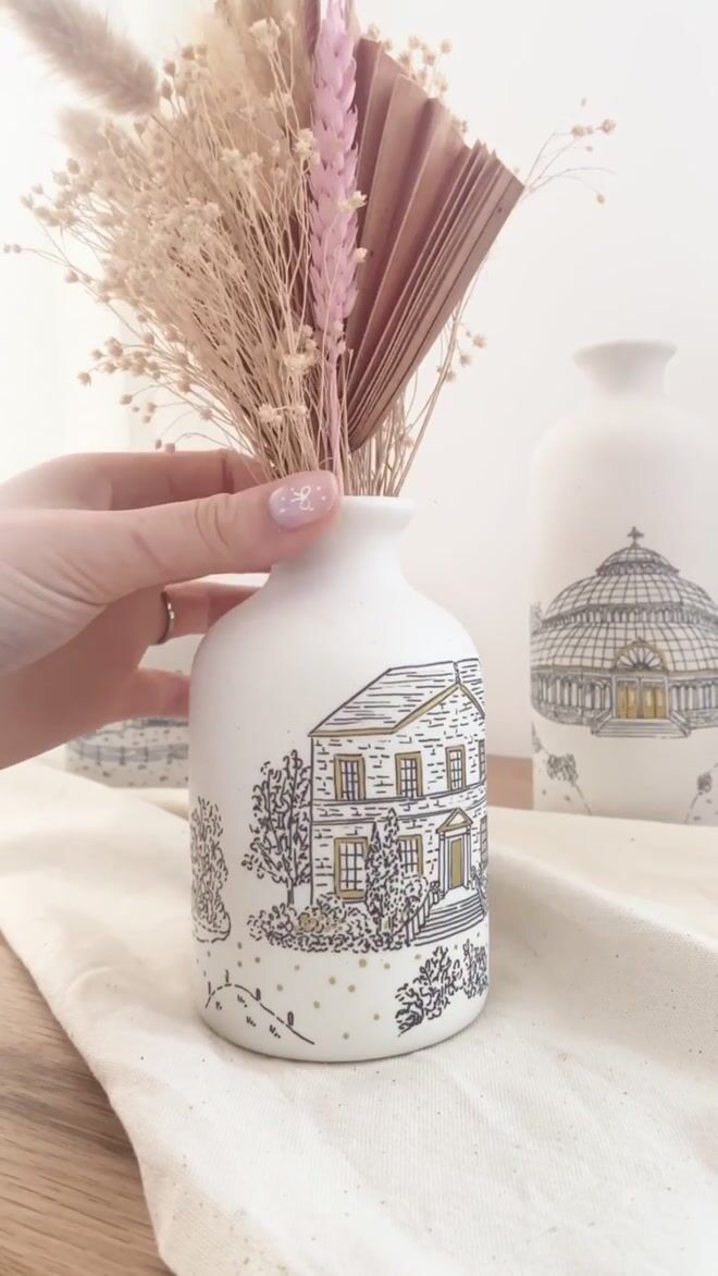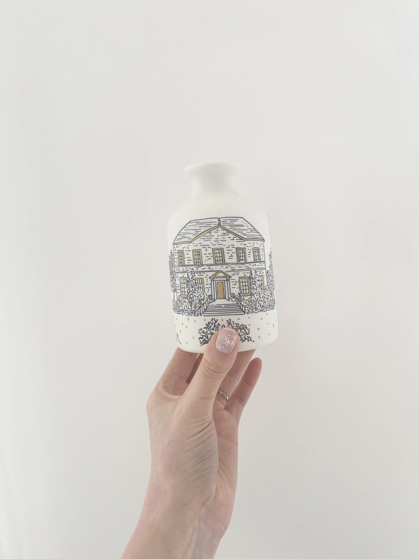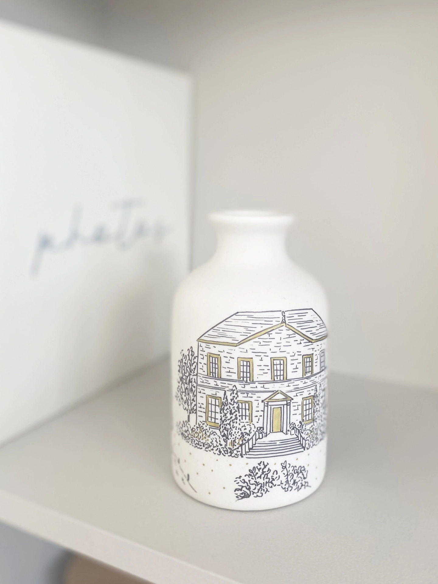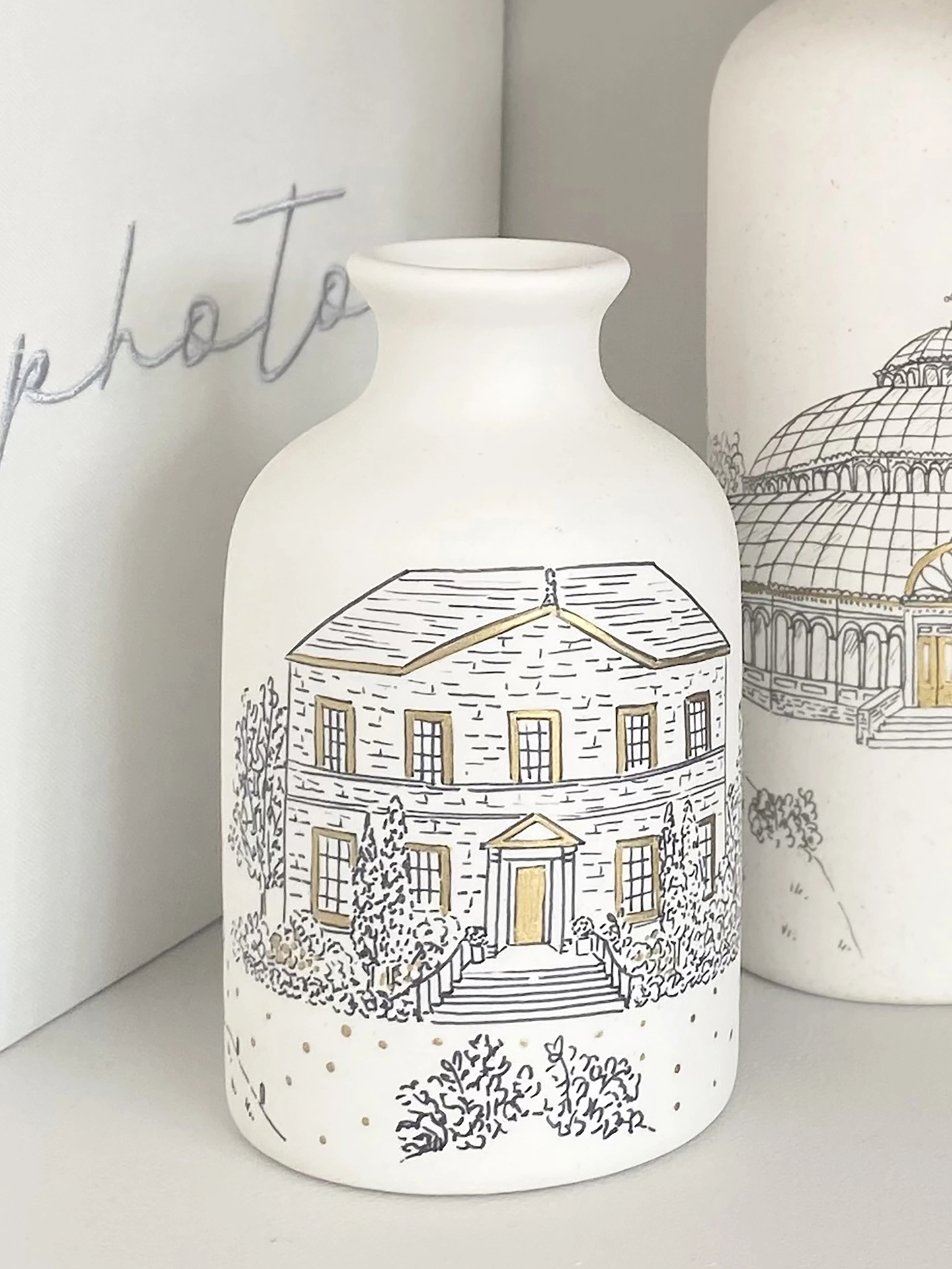 This hand drawn keepsake vase showcasing a detailed black ink drawing of your chosen venue is the perfect way to remember your wedding venue for years to come! Each line is drawn by hand, ensuring a unique and personalised touch that is truly one of a kind. Delicate touches of metallic gold gilding paint add a subtle shimmer to the illustration.