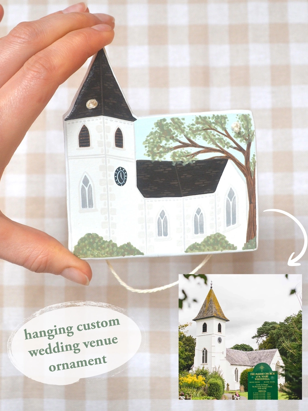 Your wedding venue ornament will be hand shaped using British air dry clay. An approximate size guide is 4 inches x 3 inches. Please note that each piece will vary slightly in shape and size depending on your building.
