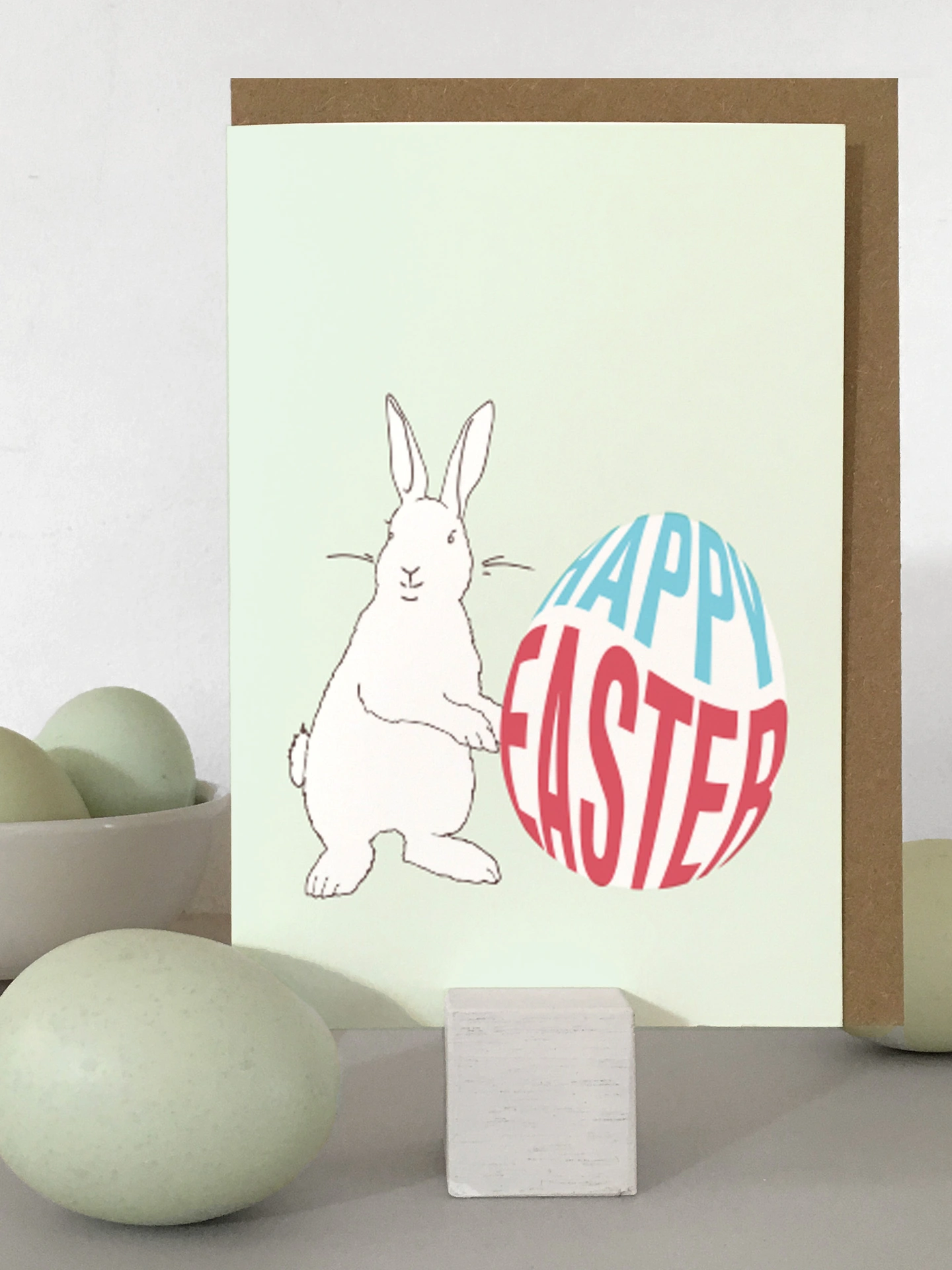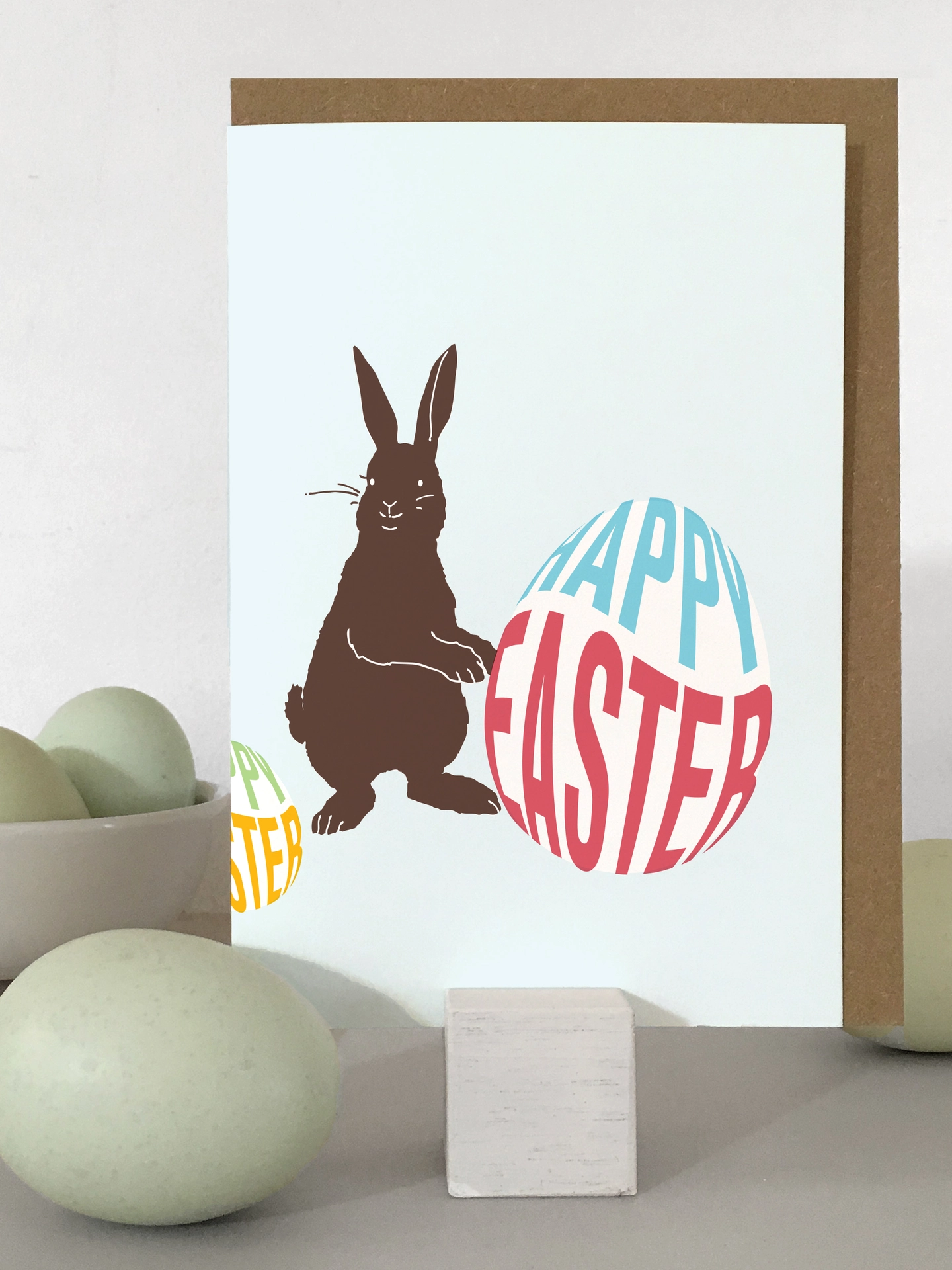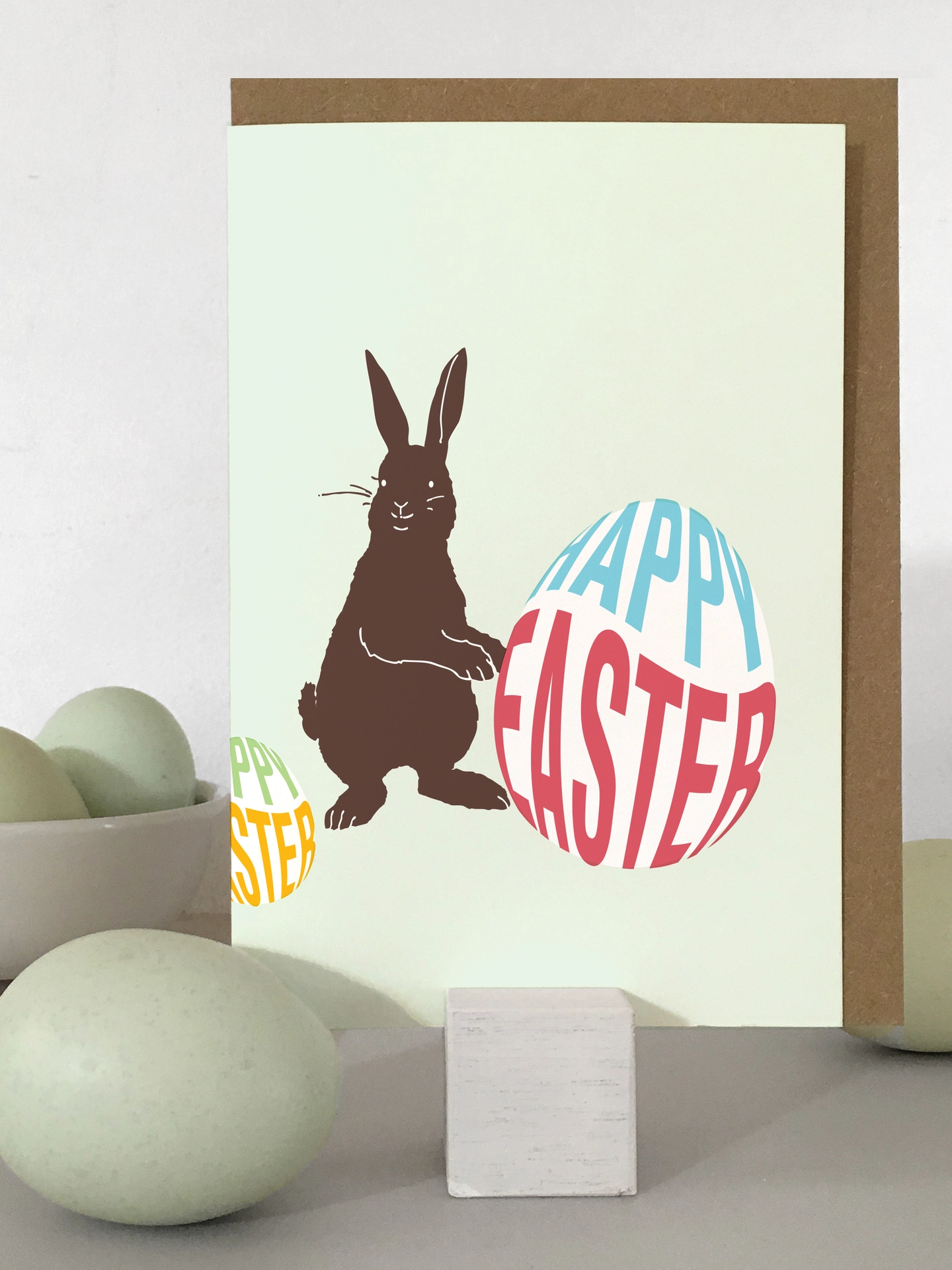 A sweet, bunny and Easter eggs Easter card. Available in 'chocolate' or 'white chocolate' colour options on four pastel backgrounds.
