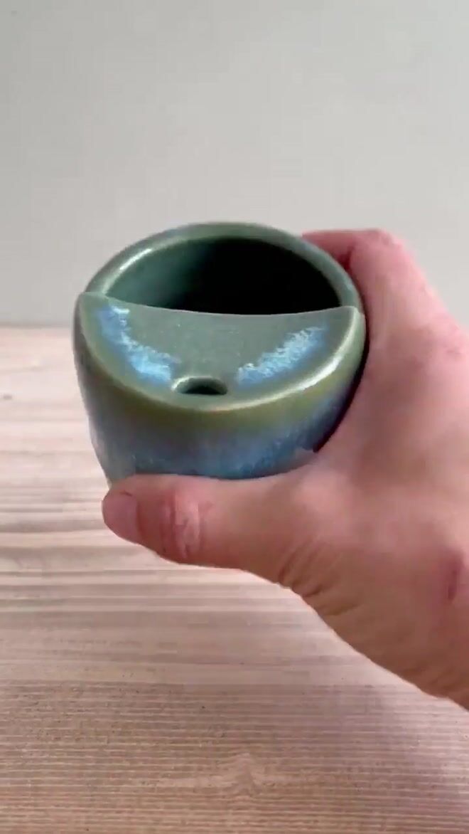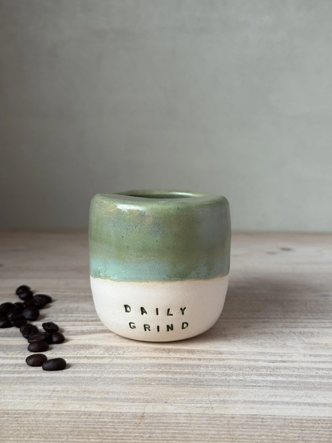 Dripping green granite on stoneware with green engraved writing ‘Daily Grind’.