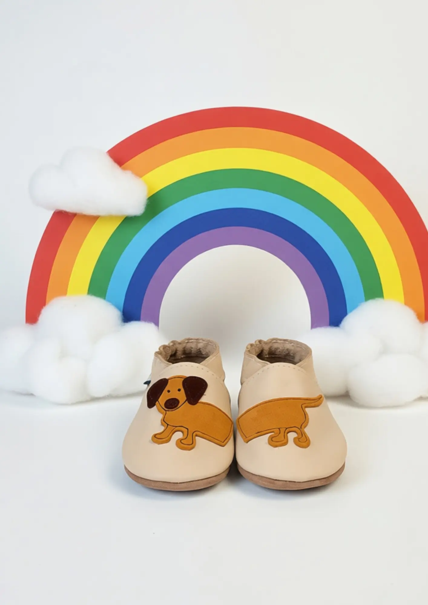 Our sweet little sausage dog Dash is a perfectly cute unisex design for little ones. Cream shoe with tan and chocolate suede dog motif detail...