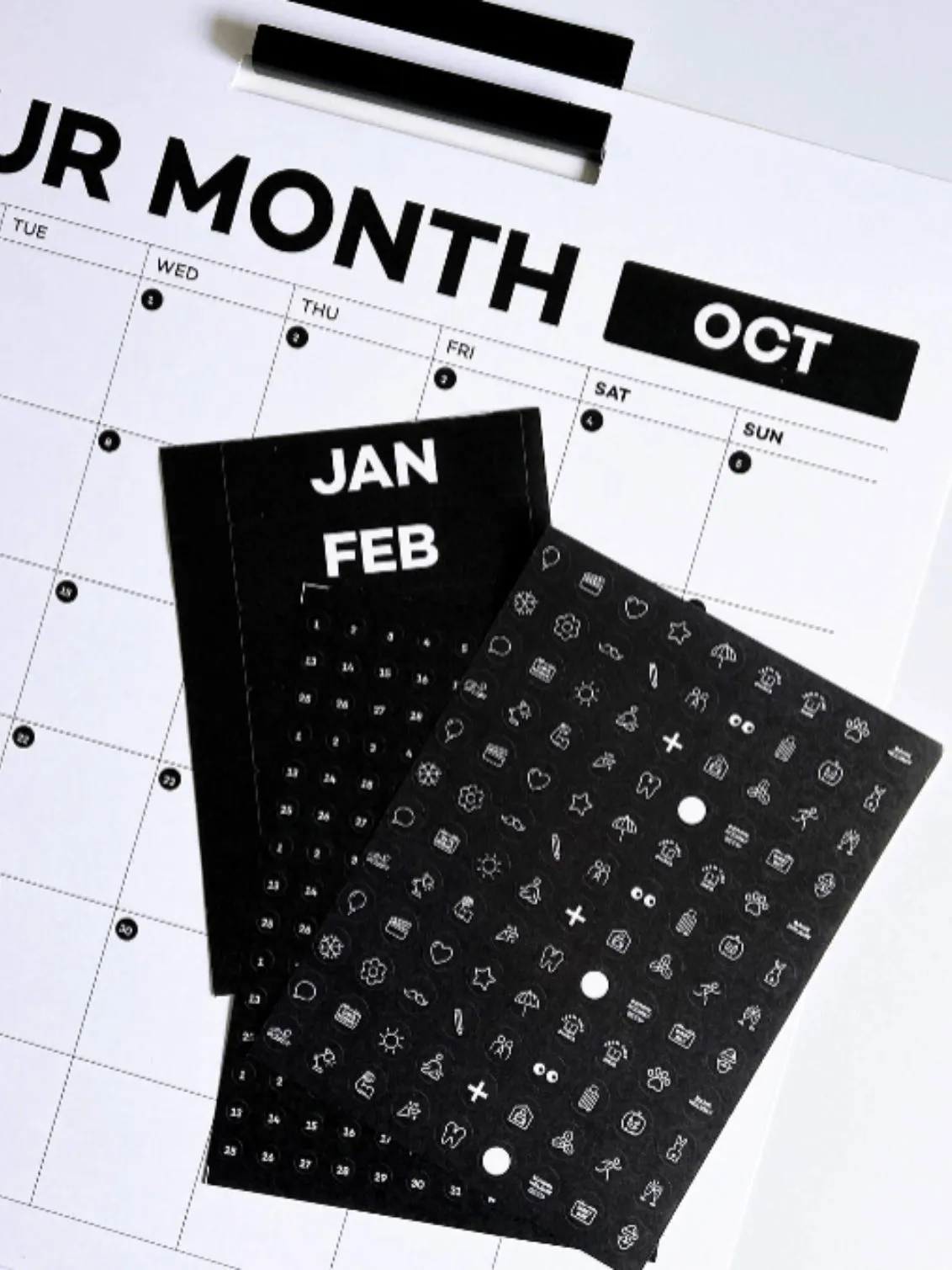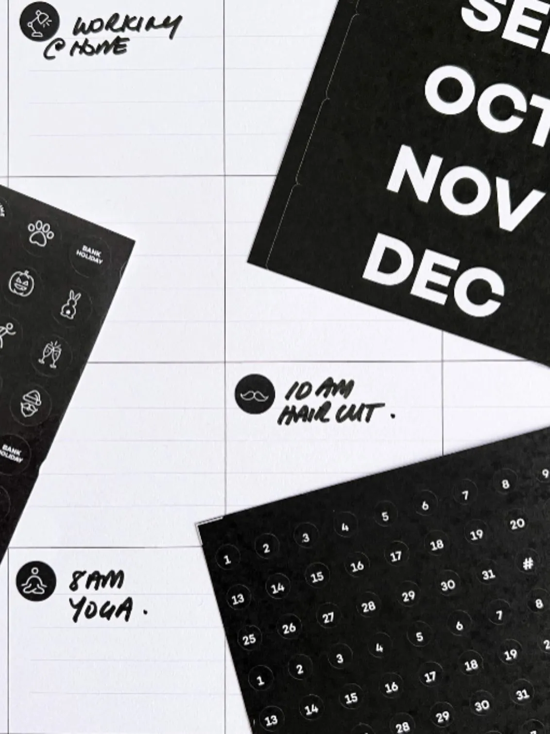 Two sheets of bold black-and-white month labels plus two sheets of playful icon stickers for everything from school terms and birthdays to dentist appointments, date nights, and holidays. Let’s make plans. And stick to them.
