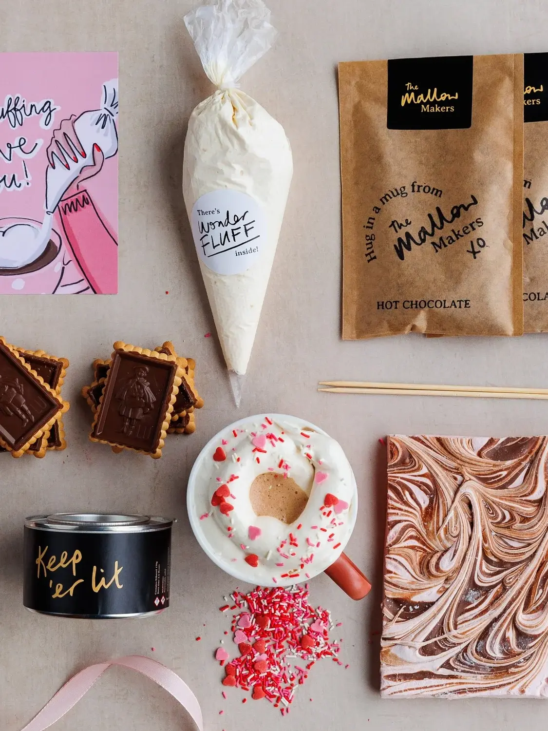 Tear off some strawberry chocolatey mallows and toast on the mini burner before smooshing between two biscuits. Make luxury Hot Chocolate with your milk of choice and top with a piped swirl of our delicious Vanilla Wonder Fluff and pink sugar sprinkles. Stay in and get cosy with this deliciously squishy box of treats. Ideal for Valentines, Galentines or any other excuse!