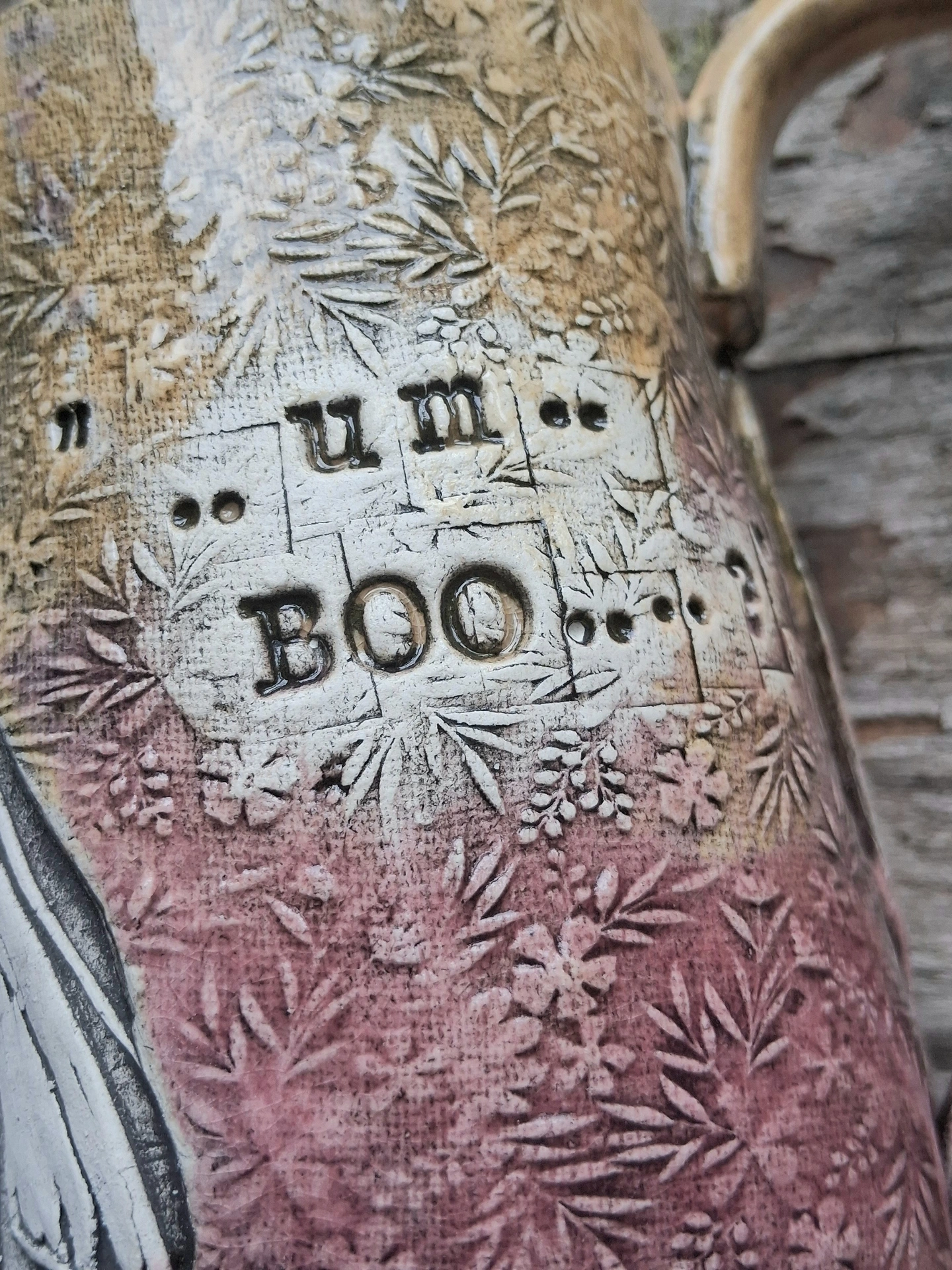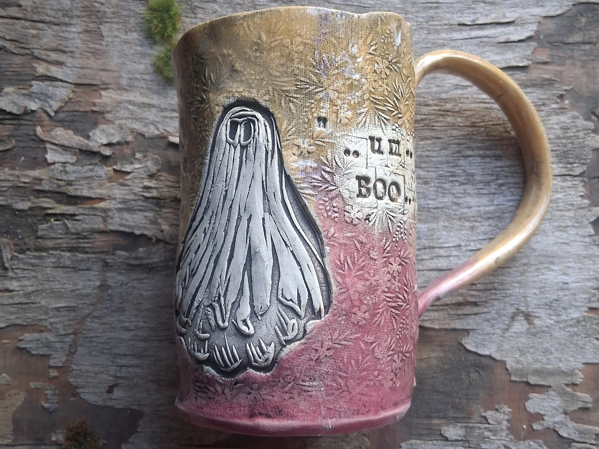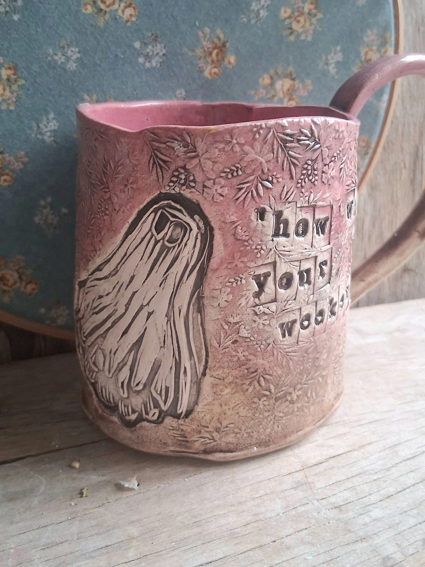Stoneware mug in Pink and Wheat/Apricot linocut with Dave the Ghost and custom text on the outside...