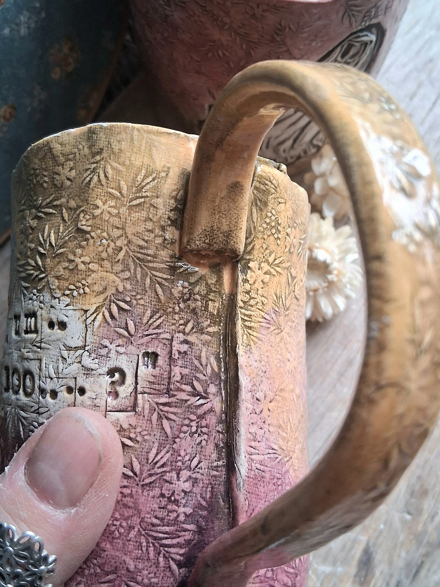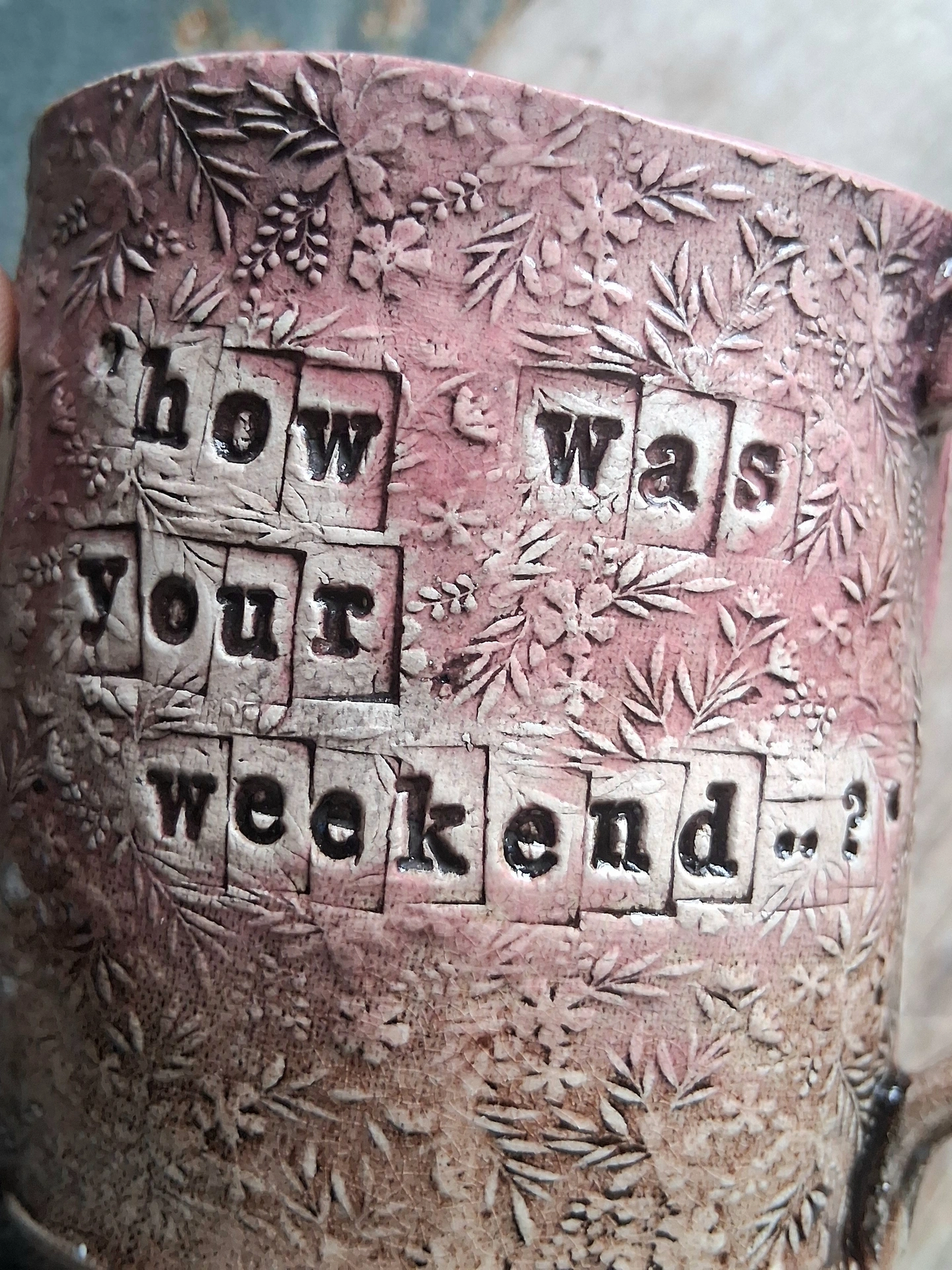 Stoneware with a linocut frame around text.