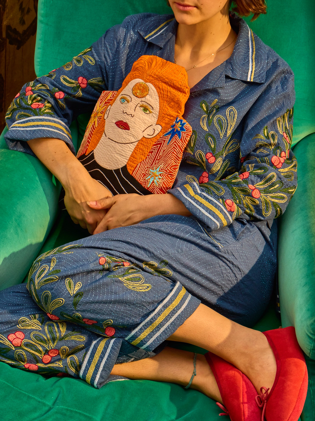 Crafted in Bangladesh by talented women artisans, each case is meticulously handmade from 100% cotton and brought to life with vibrant, intricate embroidery. Comes with the interior water bottle.