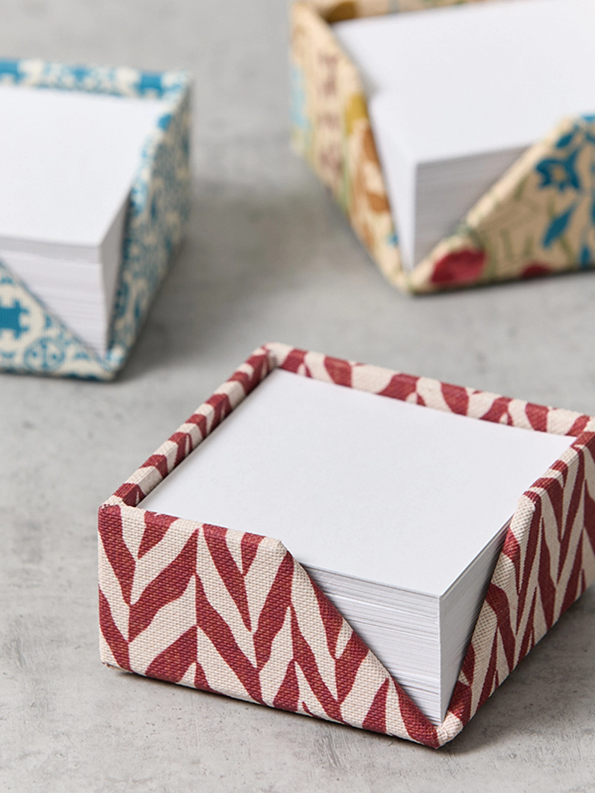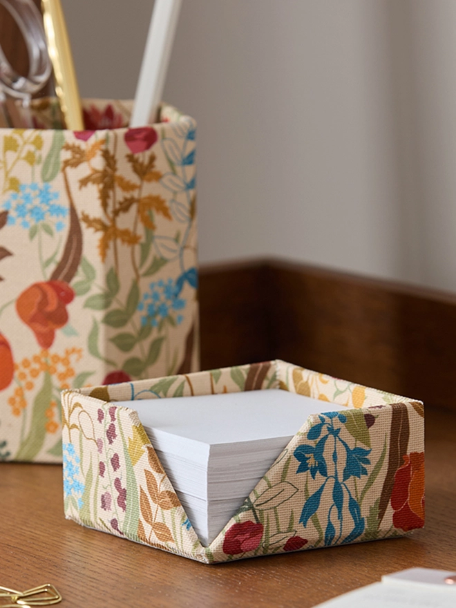 Looking for the perfect note-taker for your office or desk? Customise your luxury memo block. An ideal notepad holder. Looking for matching desk organisers, complete the look with a stylish pen pot of the same design. Our Decorative Fabric collection features seven complementary designs, each harmonising in colour. It includes designer prints from William Morris and Liberty, alongside geometric and traditional patterns.