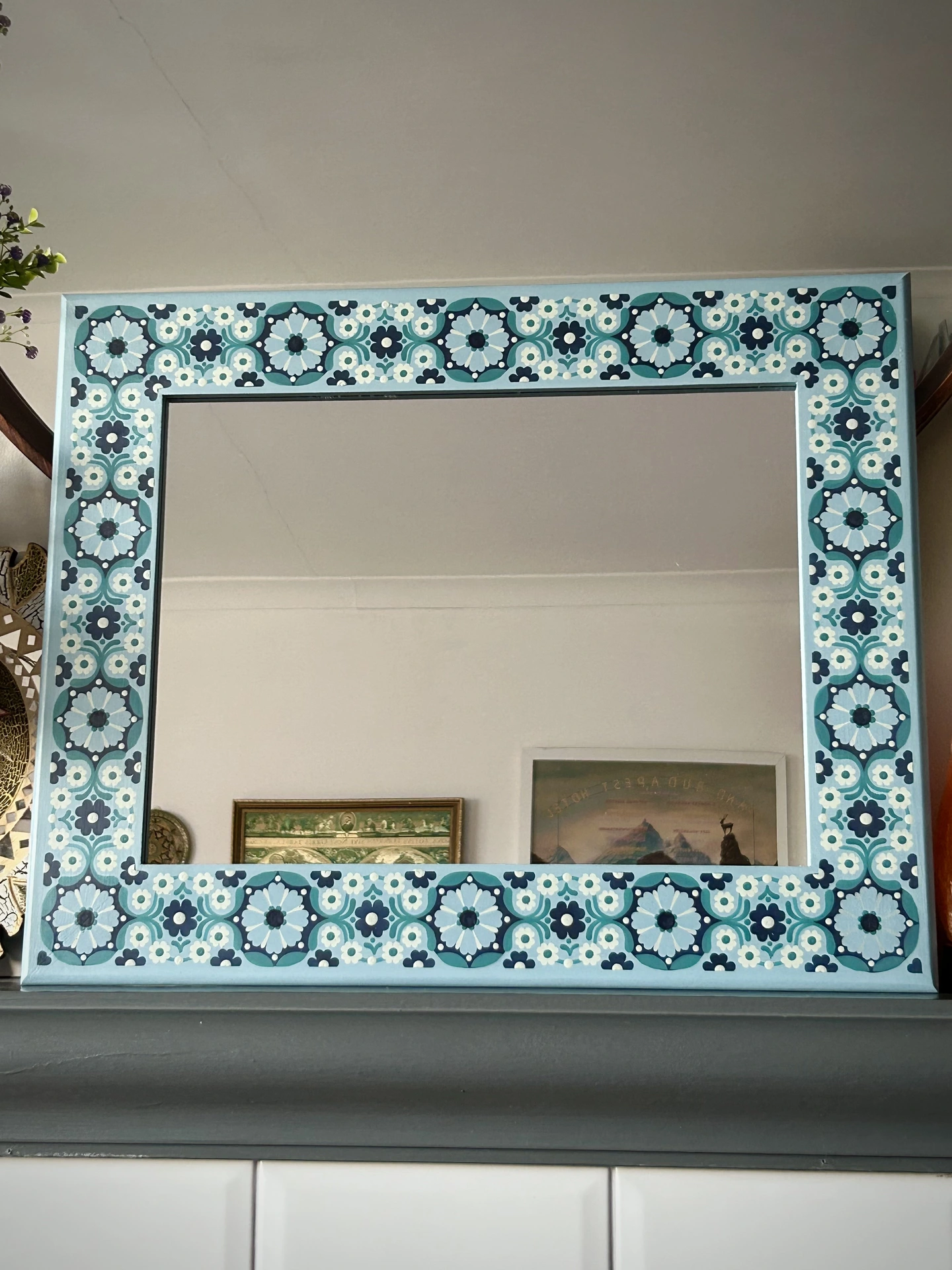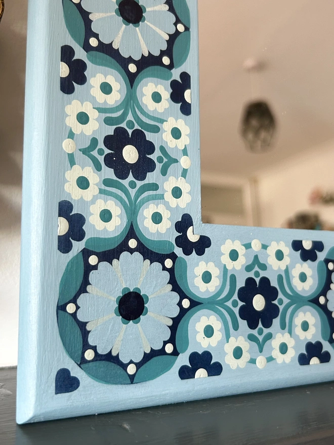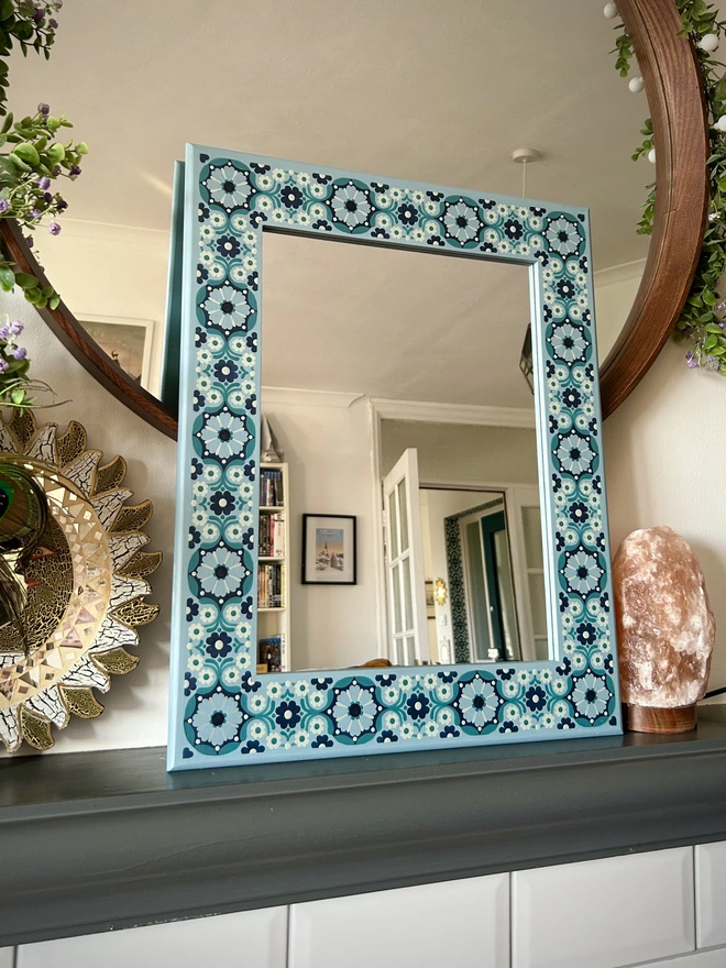 Decorative Hand Painted Wooden Mirror - Blue