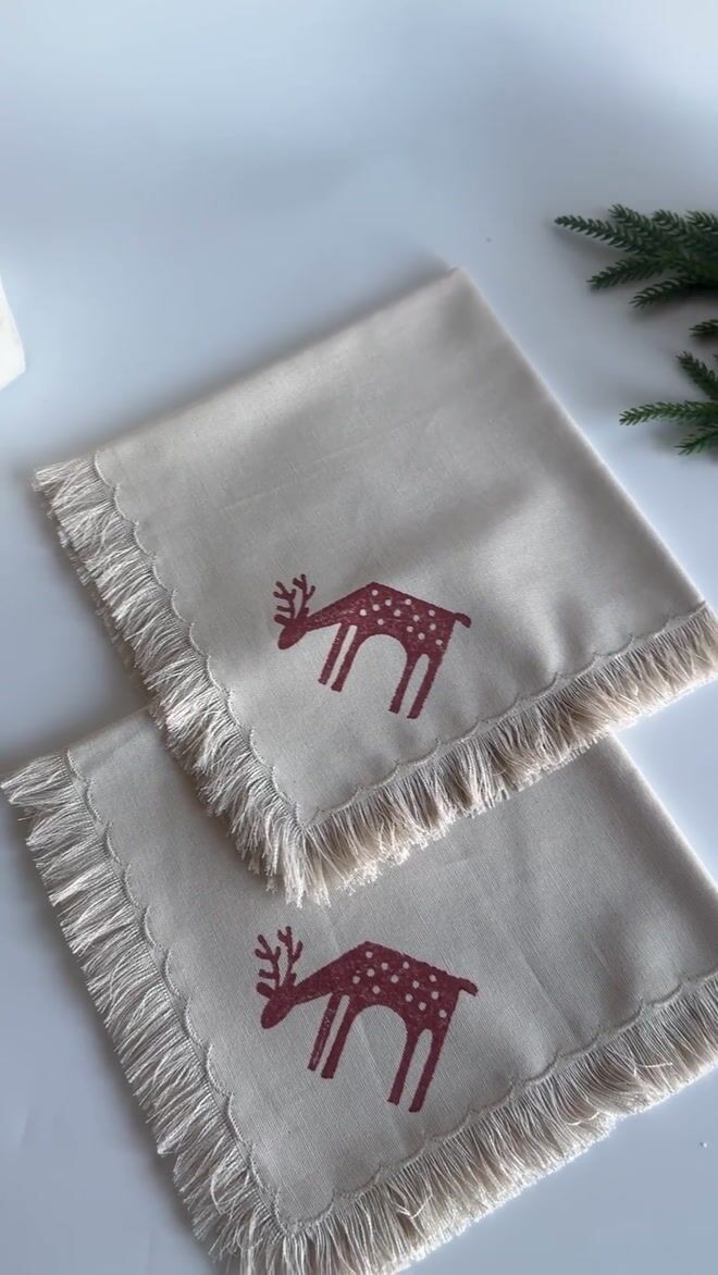 Bring festive charm and artisanal beauty to your holiday table with our cotton block-printed fringed napkins...