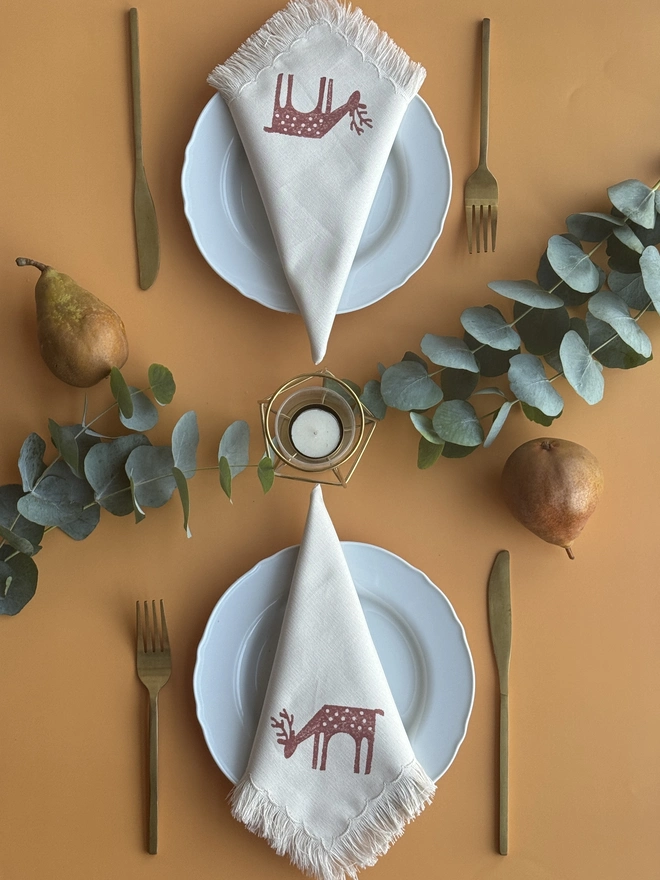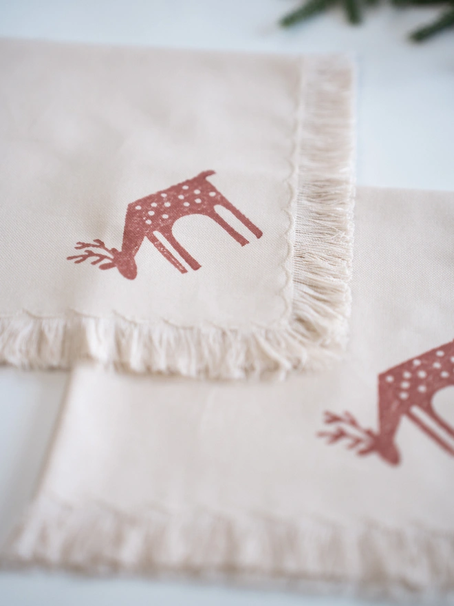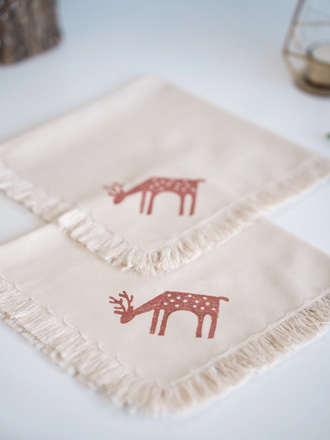 Each napkin is hand-printed using traditional wooden blocks, creating subtle variations that make every piece truly one of a kind. Made from soft, durable cotton and finished with delicate fringed edges, they add a natural, handmade elegance to any setting.