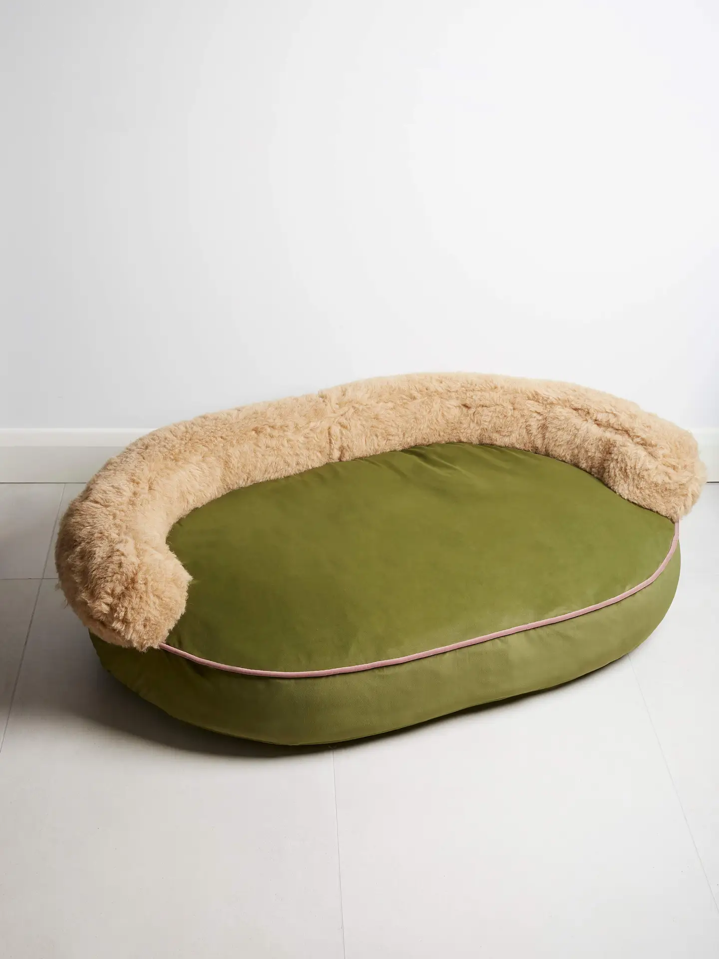 This bed puts the ‘L’ in Luxury! It's the ultimate dog bed in craftsmanship, beauty, function and style. The Deluxe is an oval shaped bed, featuring a virgin wool fleece built-in bolster, around one half of the curve.