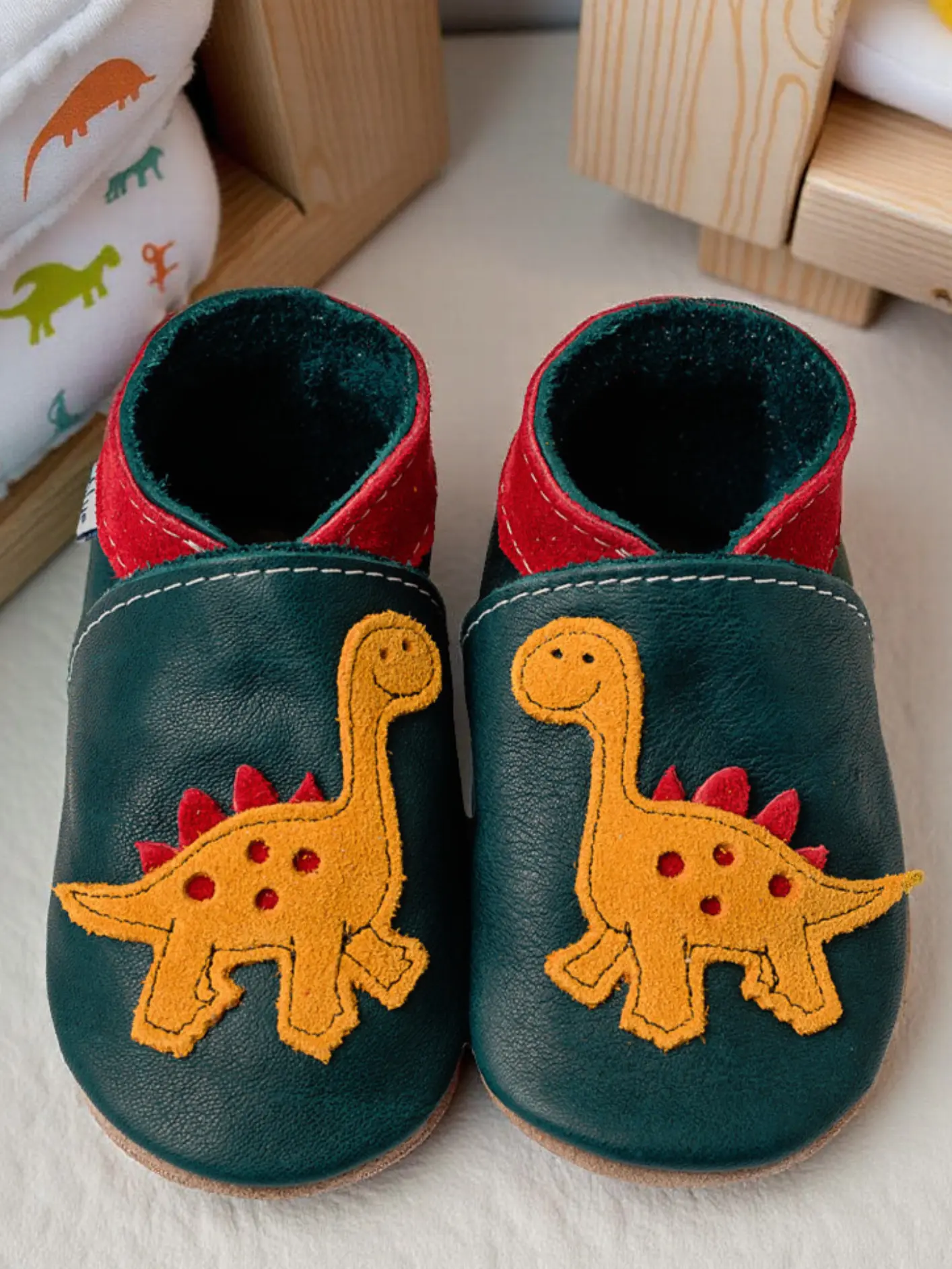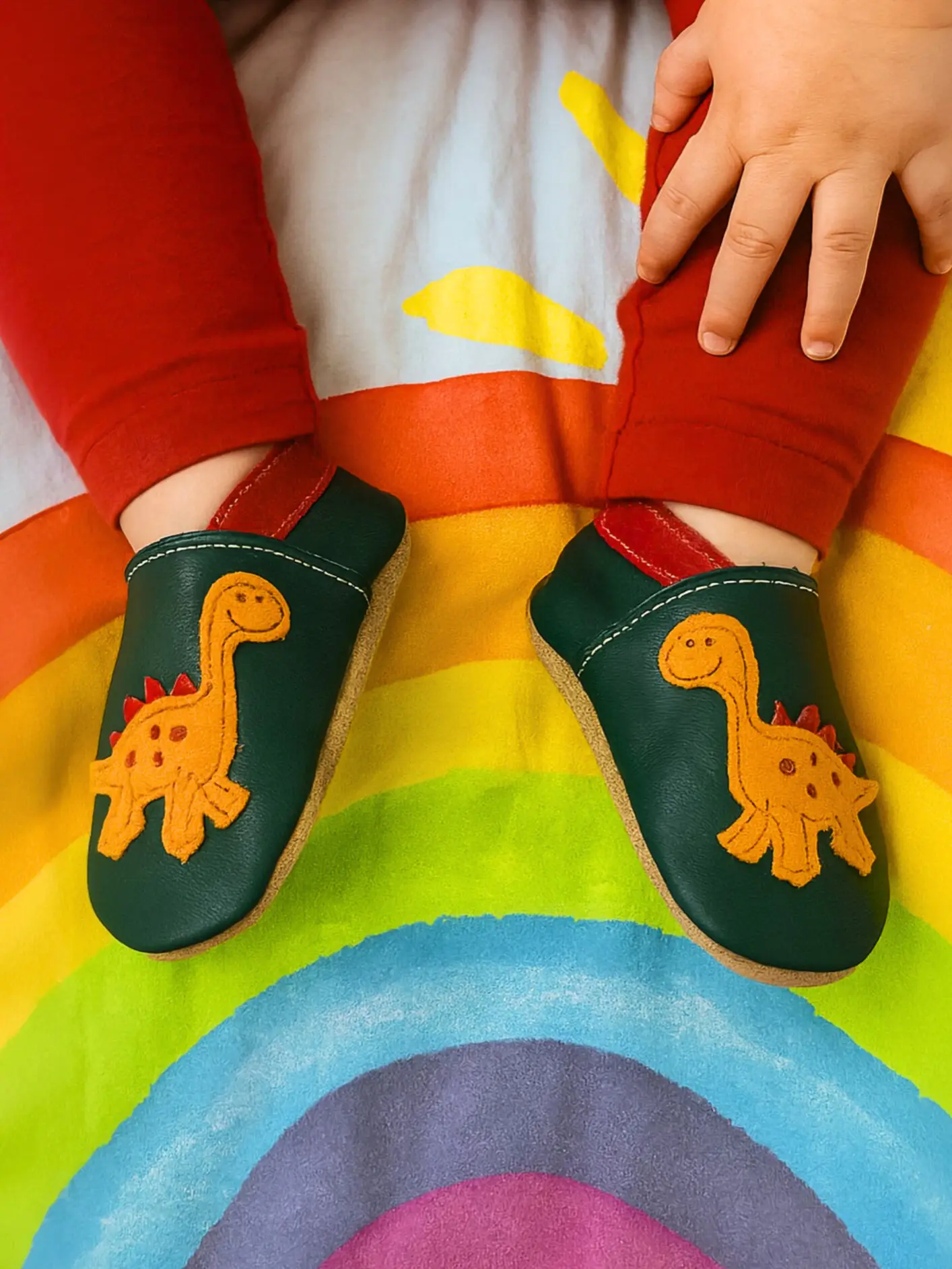 Friendly little dino from the land that time forgot! Motif orange/red suede sewn over forest green leather. Ankle collar red leather.