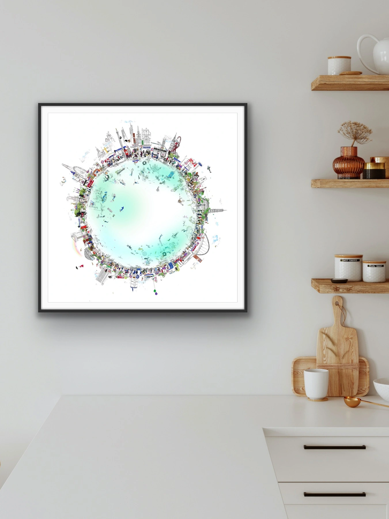 A bustling underground line brimming with culture, iconic buildings, and green spaces. It parallels the Thames path, allowing this illustration to offer a creative view of the city from above and below ground.