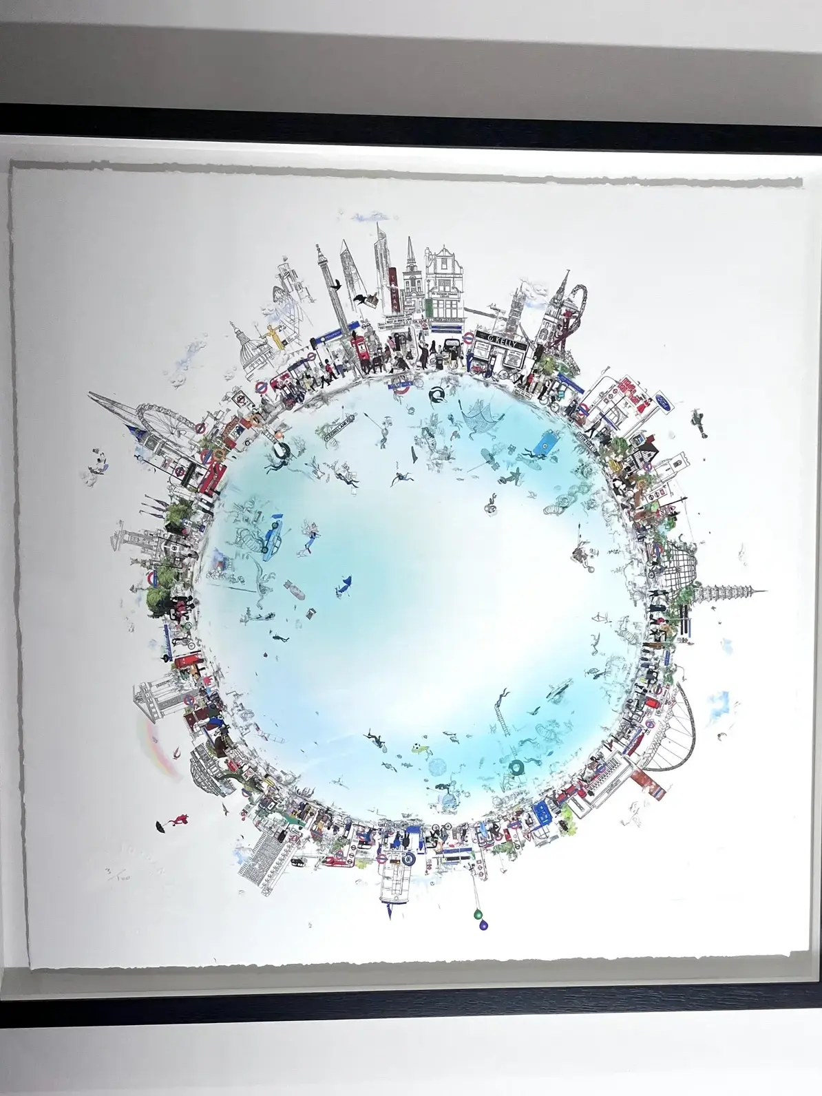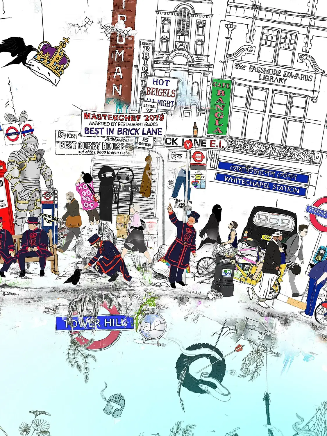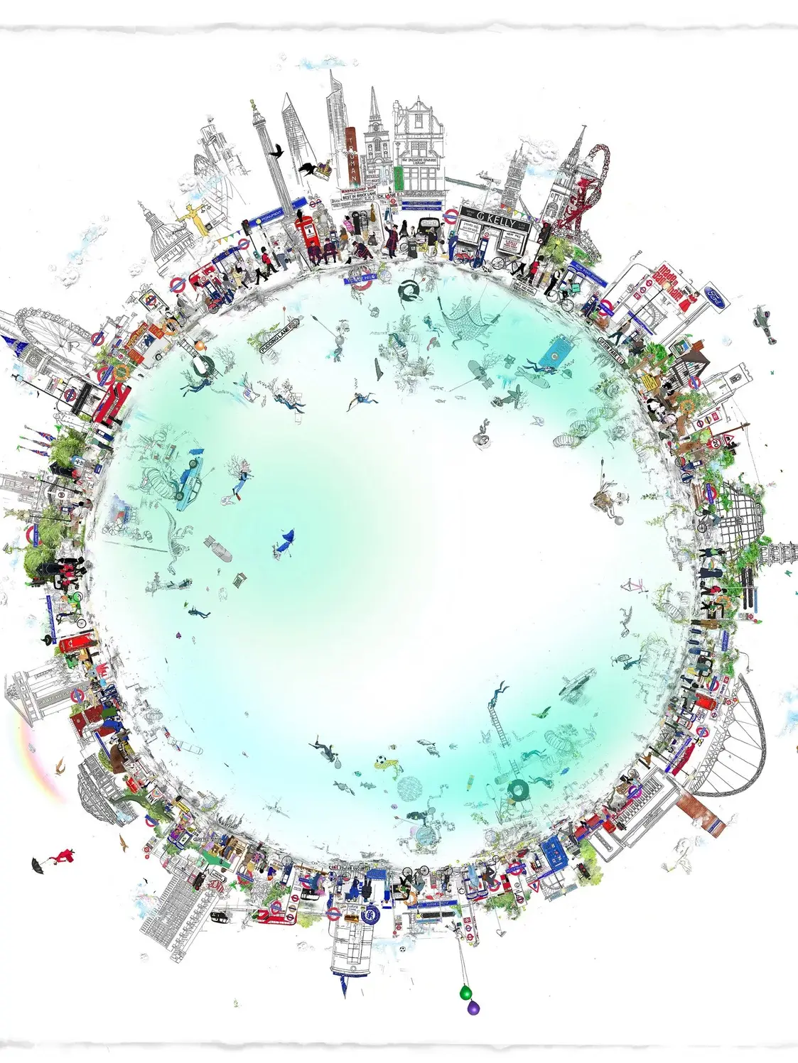 From roaming dinosaurs in South Kensington to floating Tesco bag jellyfish in the Thames, this drawing's hidden gems and tiny details reveal something new every time you look.