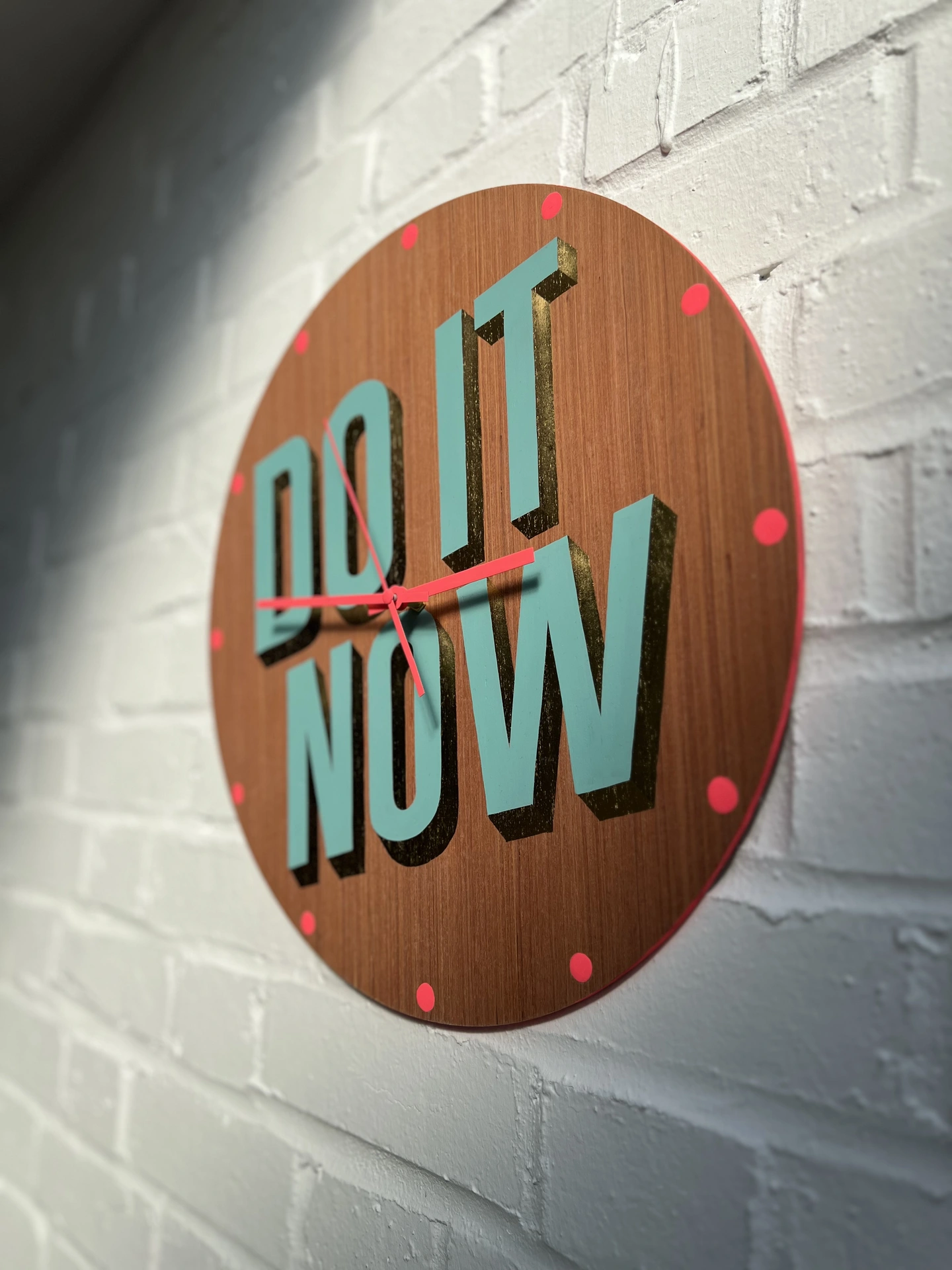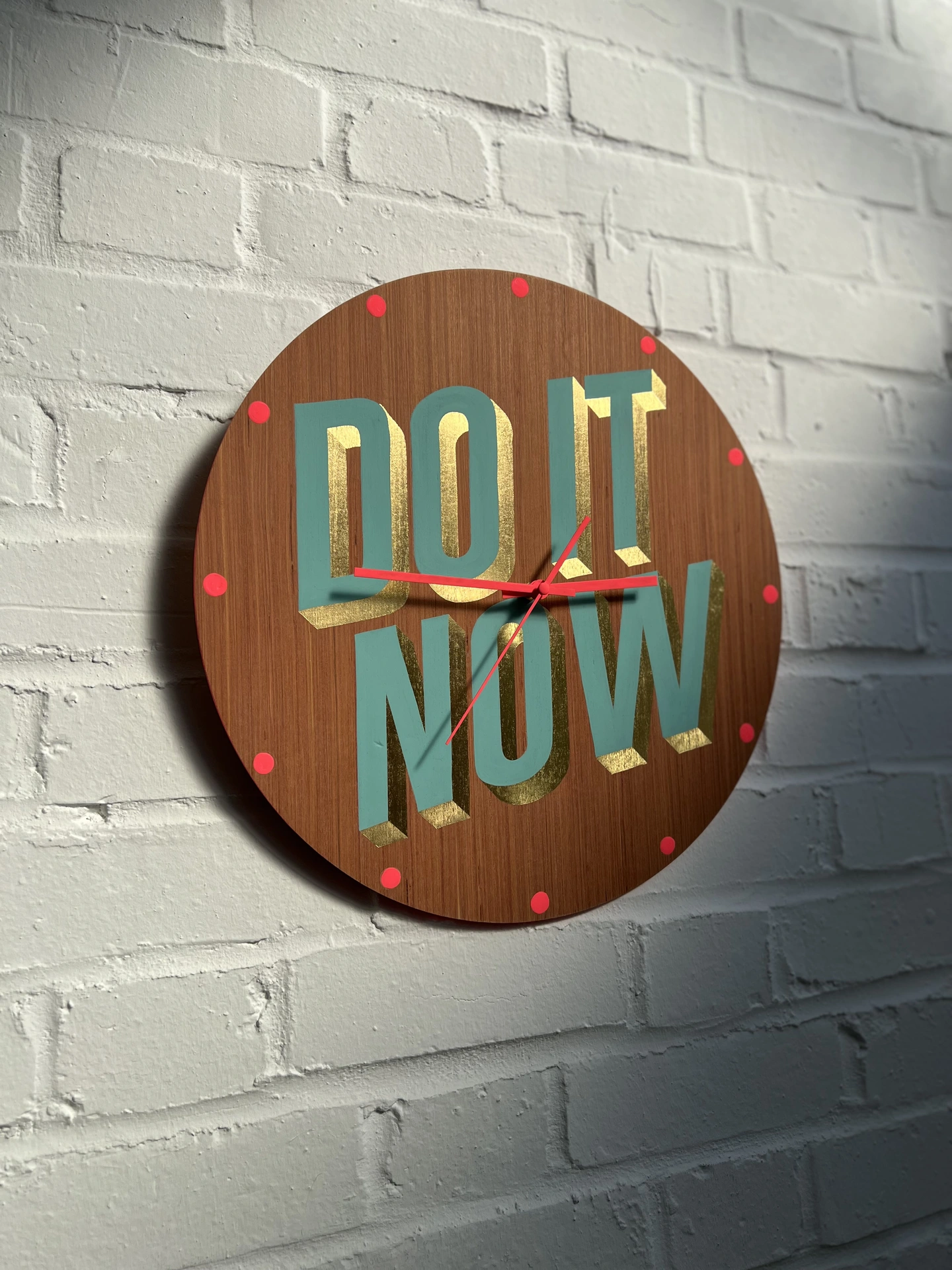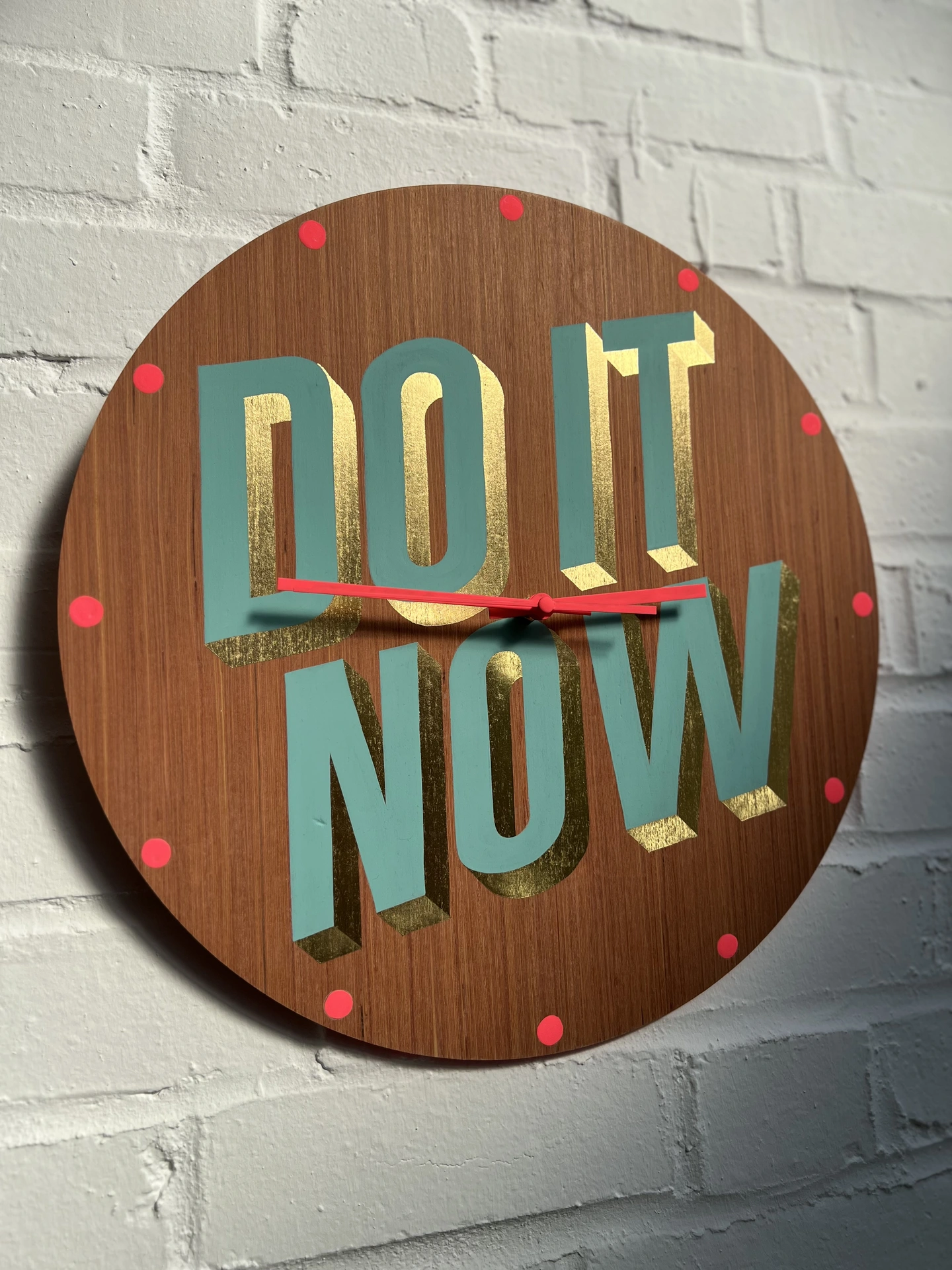 Hand painted using traditional signwriting and gilding techniques, this clock is a timely reminder to the permanent procrastinators. Crafted on birch ply, hand painted with hot pink neon and sea green flat oil paint and directionally burnished 23 carat gold leaf, the face features the motivational phrase “DO IT NOW,” bringing a touch of humour to its timeless design. Each letterform is carefully drawn and painted by hand, creating a characterful yet precise finish. A modern heirloom that celebrates playful words, this piece adds artistry, craftsmanship and a knowing smile to any space.