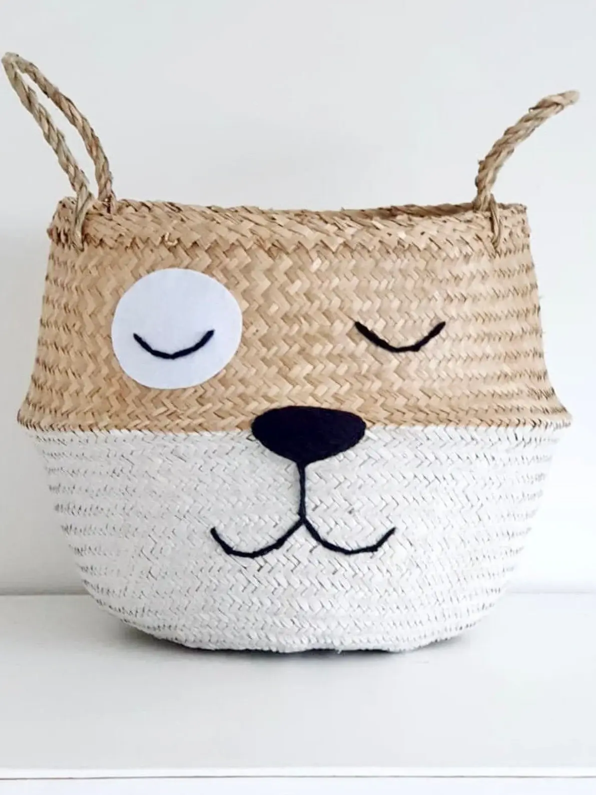 A handmade seagrass belly basket with an embroidered dog’s face in various sizes, with a white base and felt eye patch.