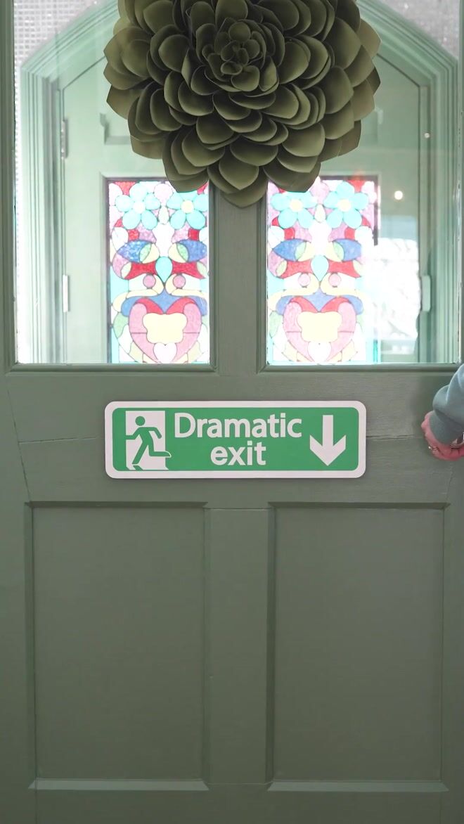 This 'Dramatic Exit' sign is a humorous take on the regulatory UK fire exit sign. Featuring the same running silhouette person exiting a door and a similar font but the difference is the background is rainbow and instead of "fire exit" it reads "dramatic exit" which is a theatrical phrase for someone leaving a room or area in an over the top manner.