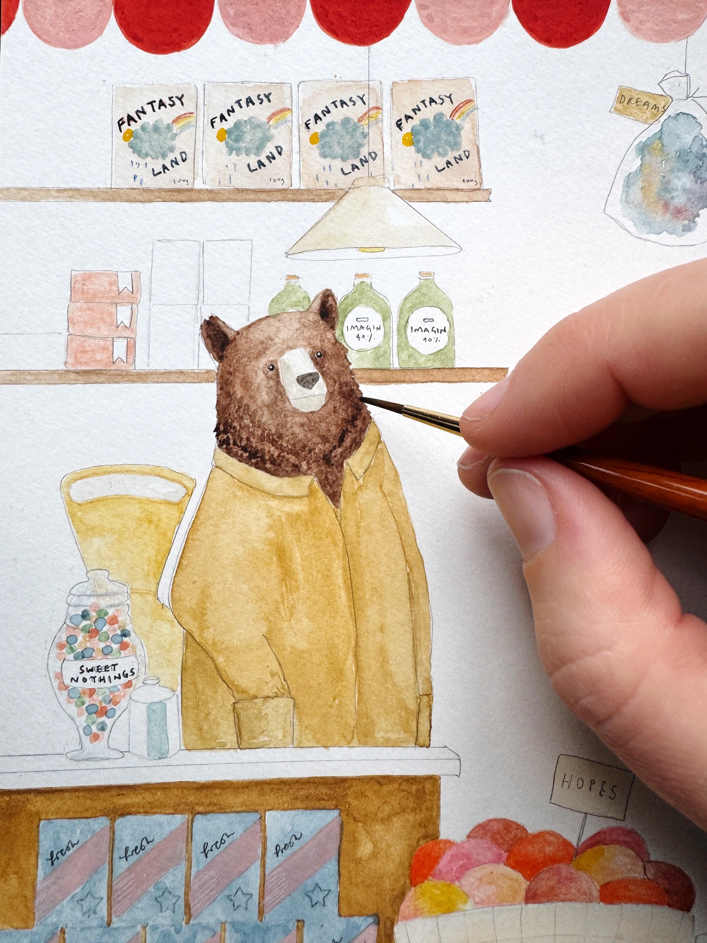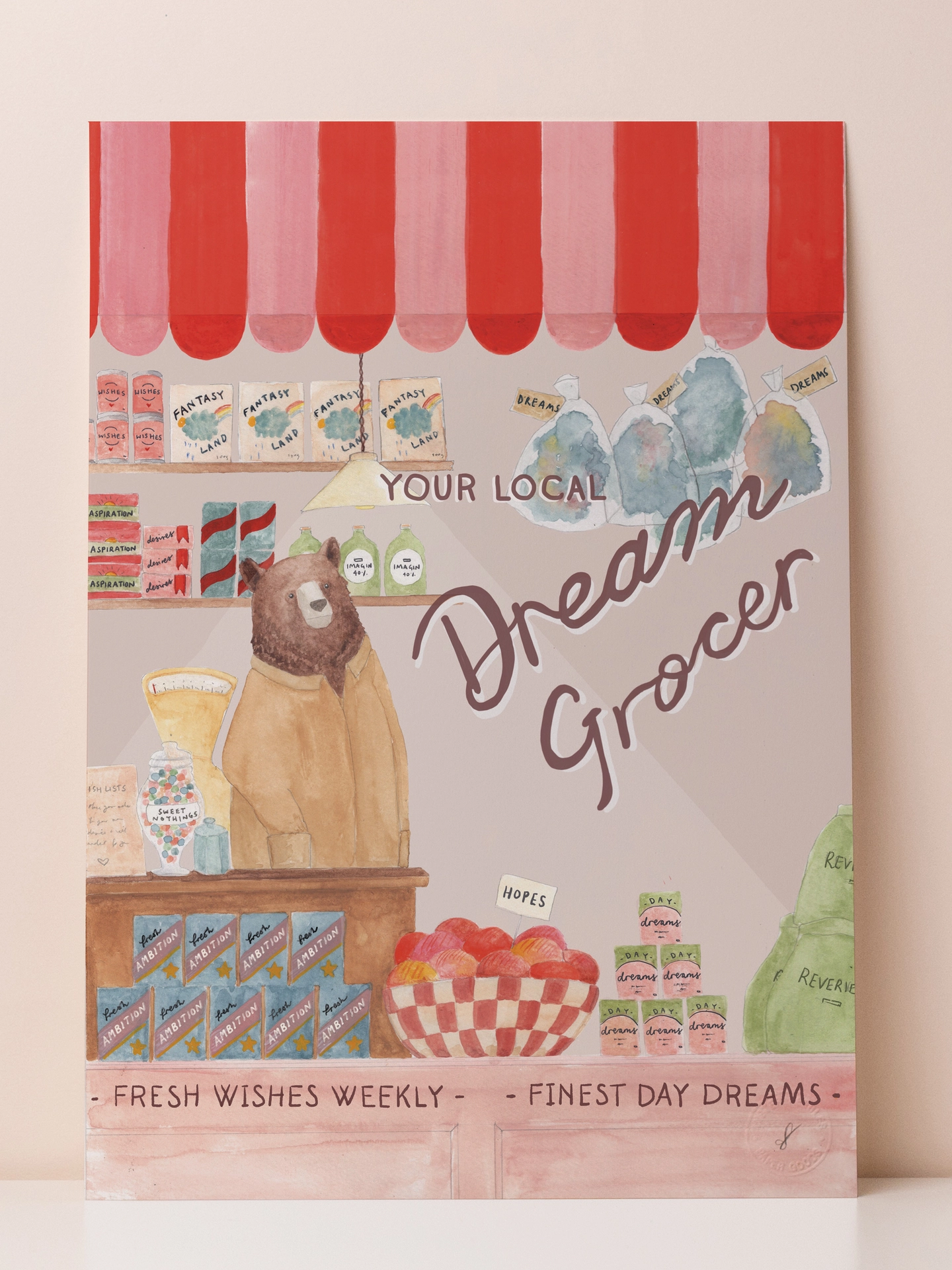 An art print from an original watercolour illustration of the dream grocer, a bear shop keeper, well stocked with dreams, wishes and heart's desires. The perfect print to inspire going after those dreams of your own.