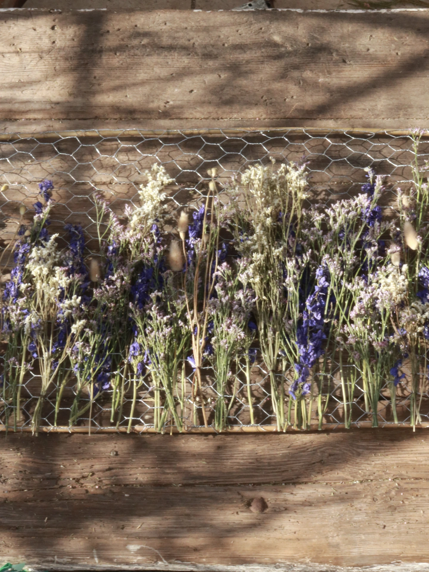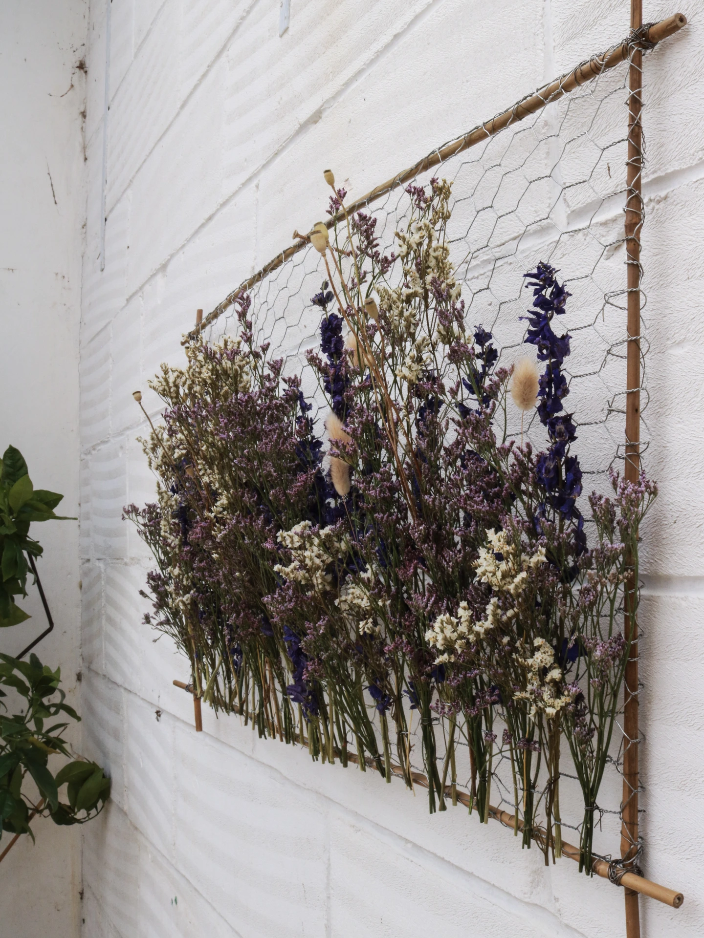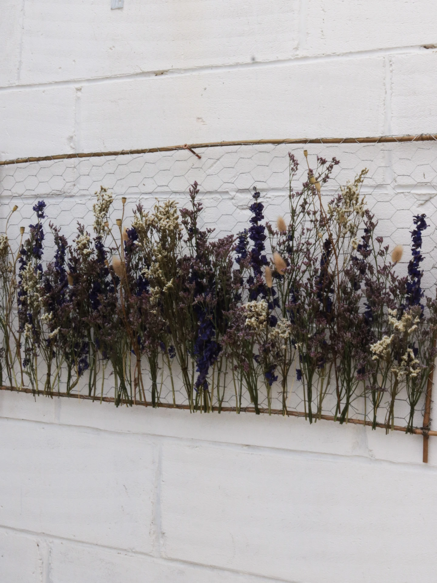 Created from dried flowers on a bamboo and chicken wire panel.