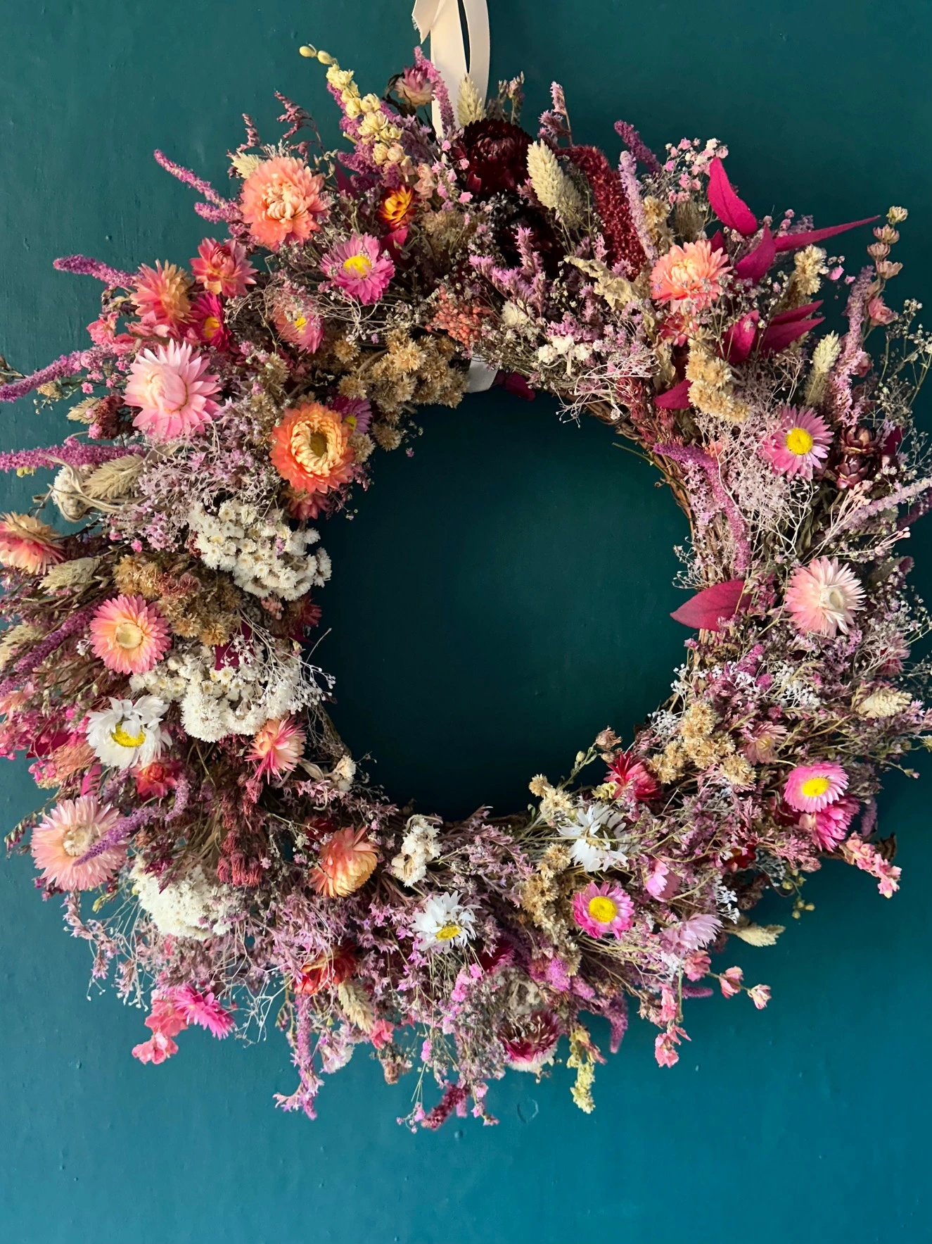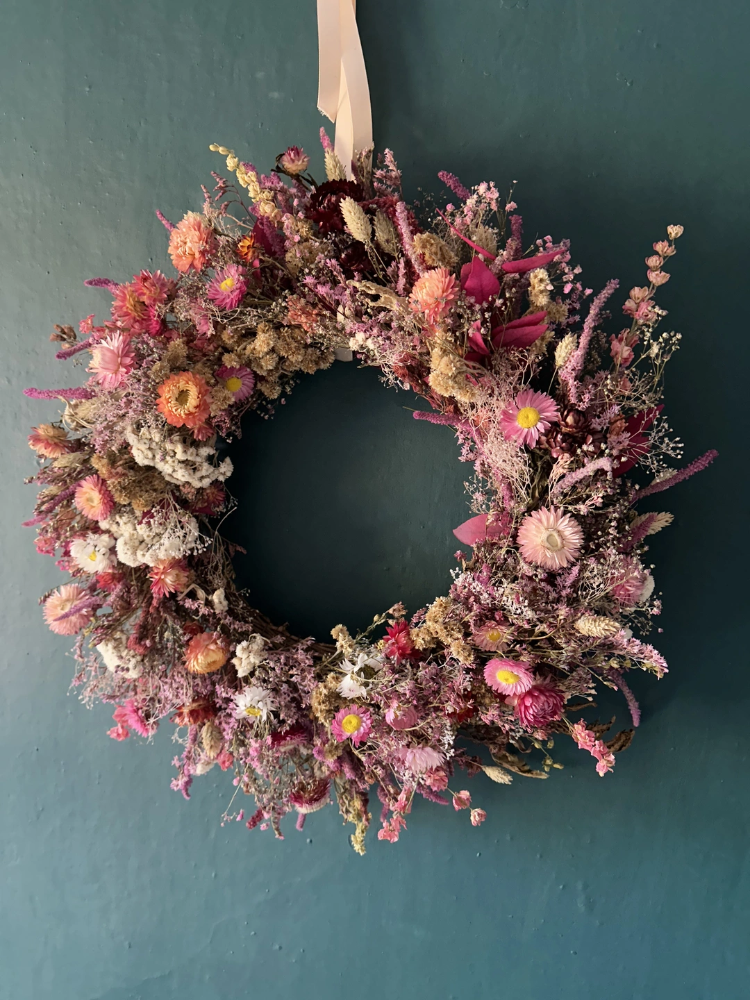 A soft romantic dried floral wreath with blush pink strawflowers, dried pink gypsophilia and amaranthus. This piece brings a gentle glow to any room, sunset tones that celebrate all the beauty of dried florals. Finished with a pale pink ribbon for effortless hanging.Perfect for hallways, feature walls, bedrooms and would make a beautiful gift.