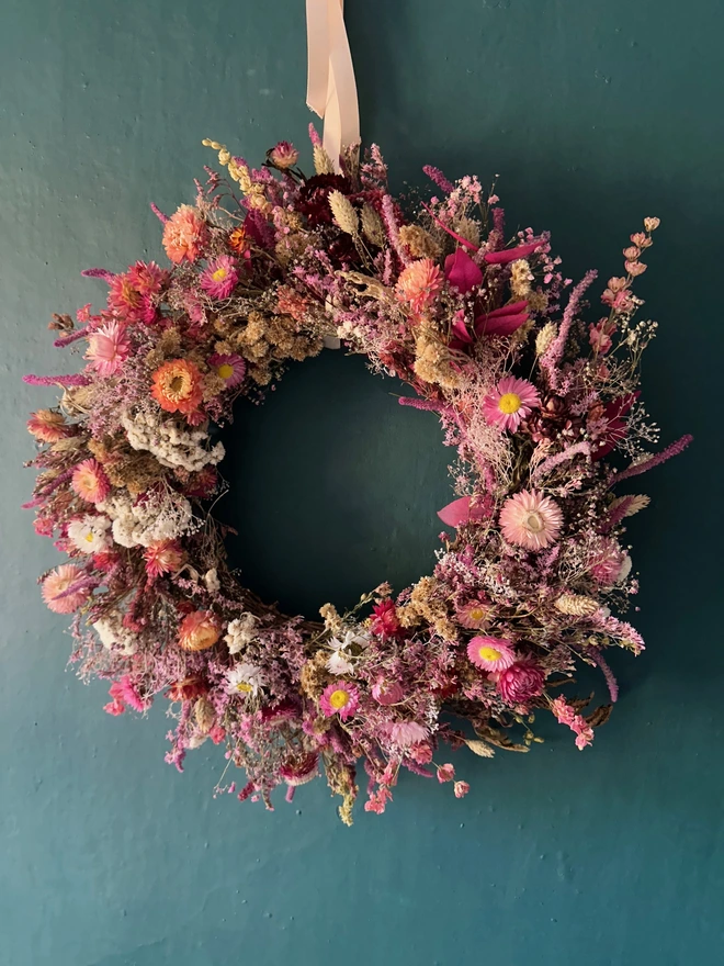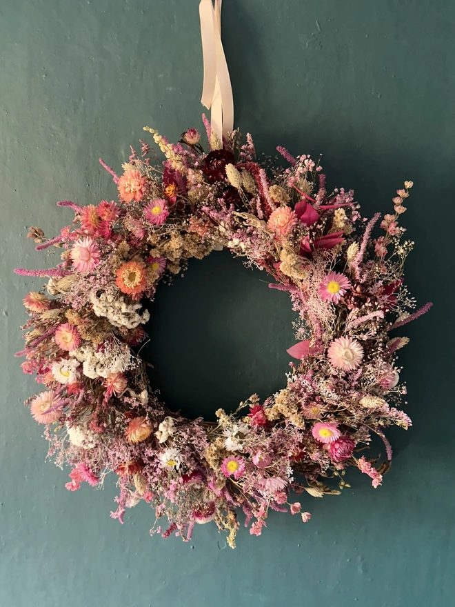 A soft romantic dried floral wreath with blush pink strawflowers, dried pink gypsophilia and amaranthus. This piece brings a gentle glow to any room, sunset tones that celebrate all the beauty of dried florals. Finished with a pale pink ribbon for effortl...