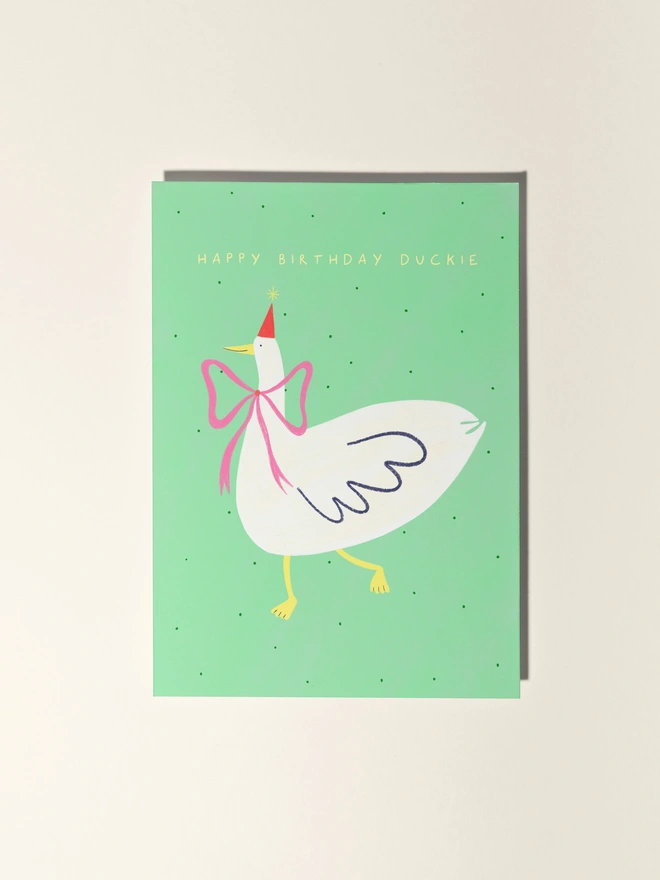 Cute birthday card featuring a white duck in a party hat with a bow on a green background. Handwritten text reads 'Happy Birthday Duckie'...