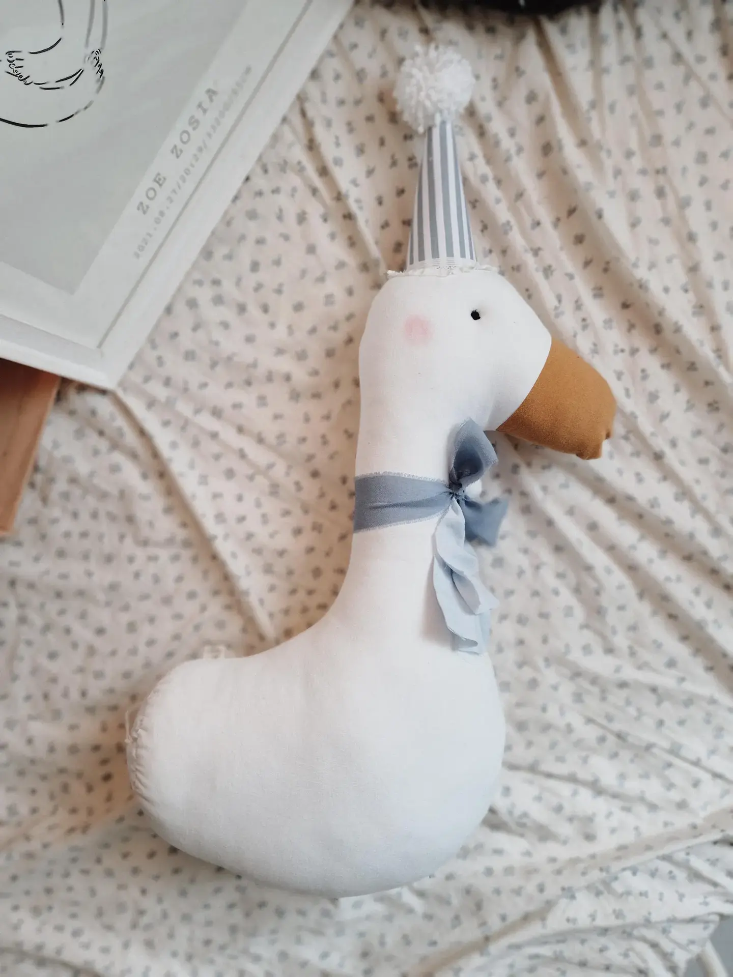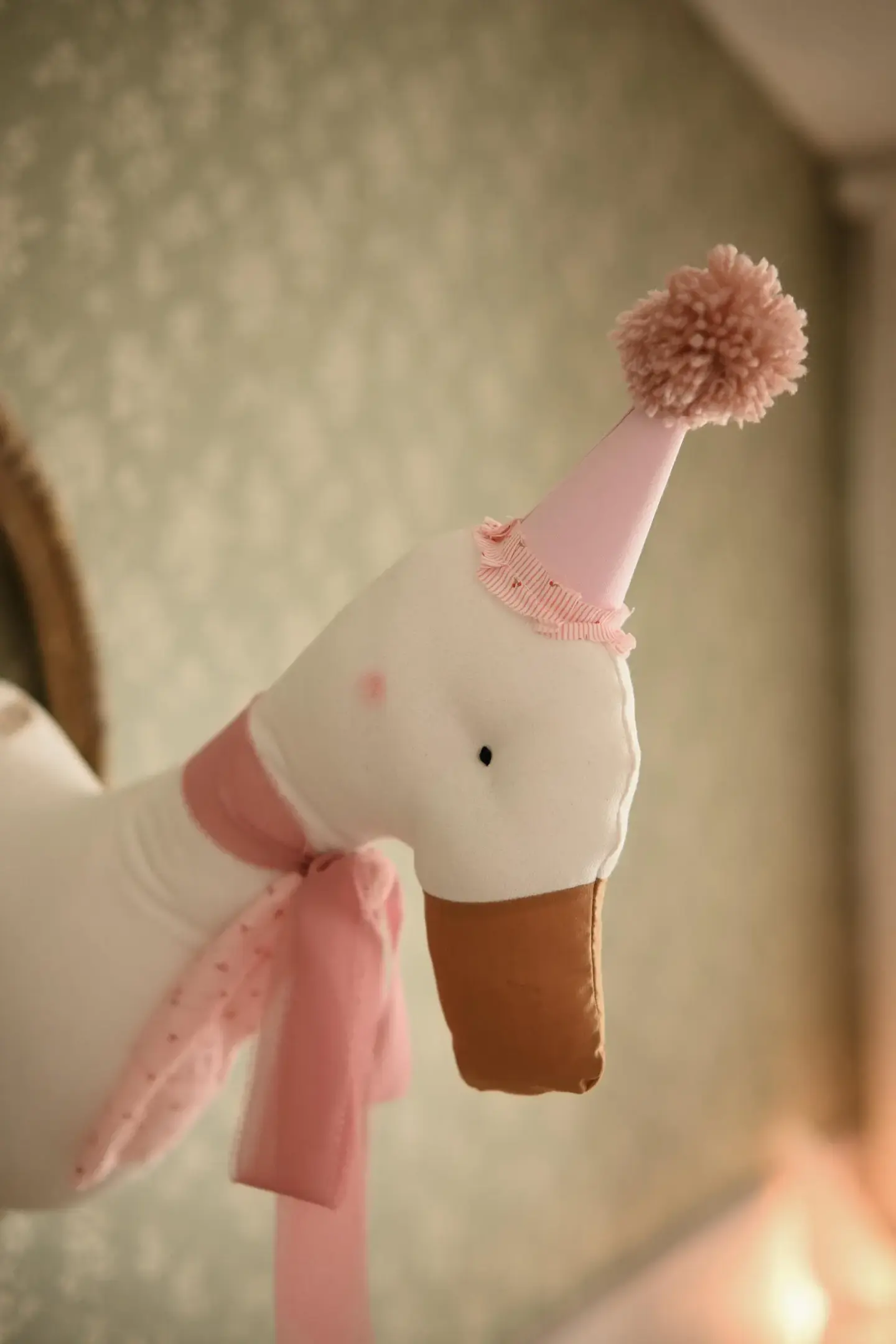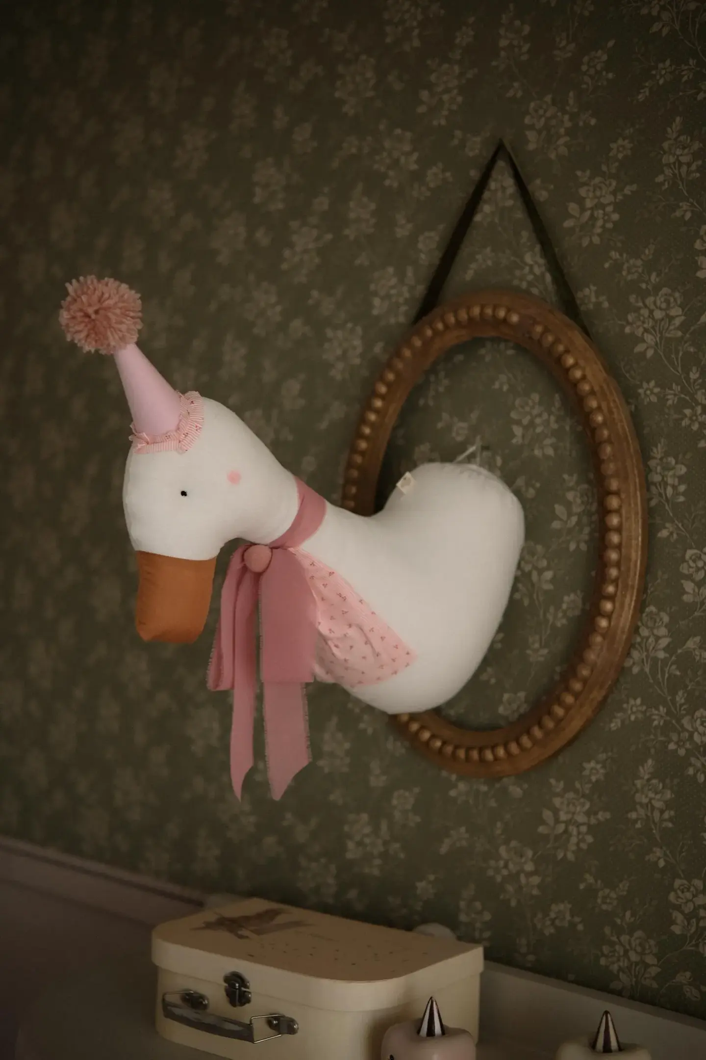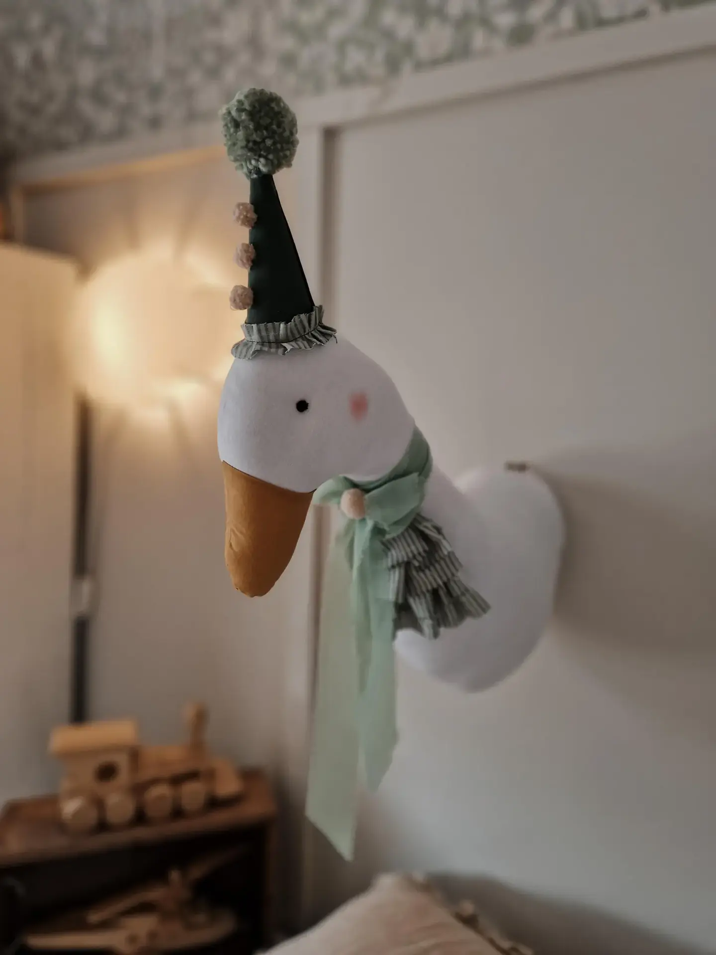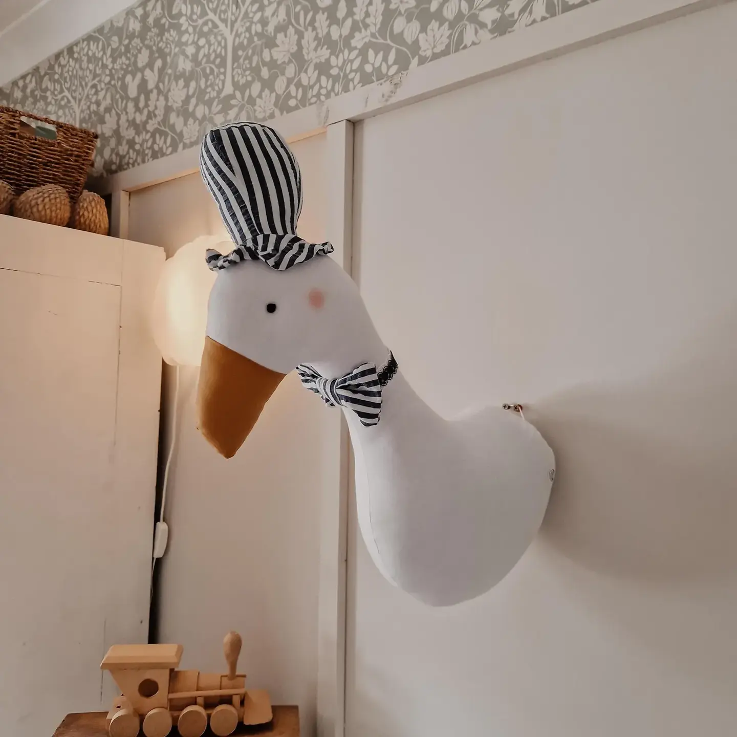 Add a touch of whimsy and elegance to your nursery with this adorable plush duck head wall mount. Handmade from high-quality cotton, this stuffed duck trophy is perfect for a circus or woodland-themed baby room. Whether you're decorating a cozy nursery or looking for a unique baby shower gift, this charming duck head adds softness and personality to any space.