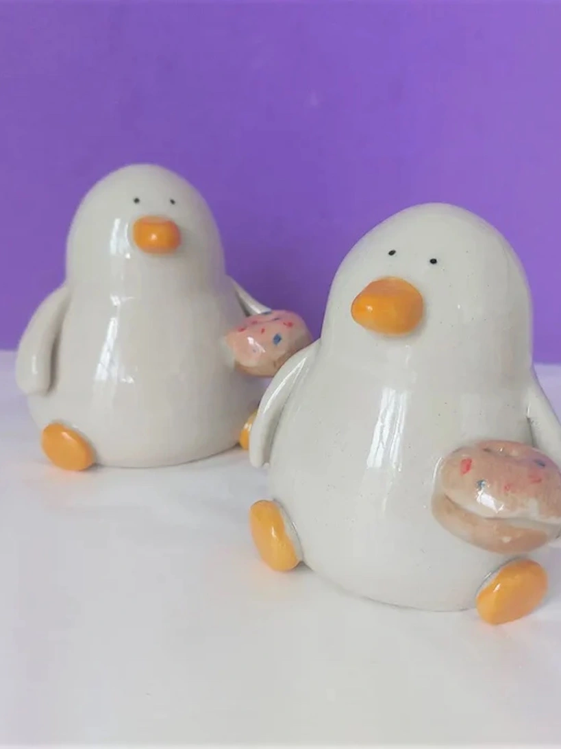 Duncan is 100% handmade from start to finish. Like the other foodie friends he is made from wheel-thrown white stoneware clay, added ducky features and doughnut, under-glazed, biscuit fired and transparent glazed then gloss fired to stoneware.