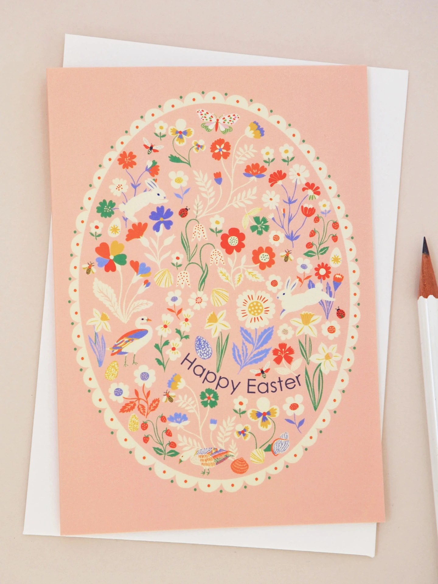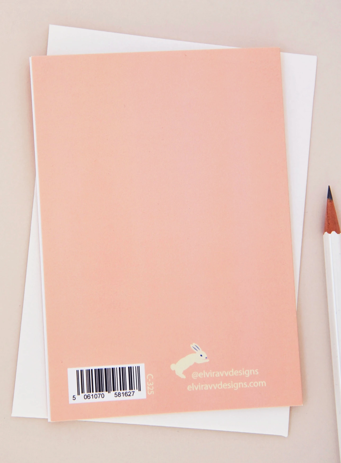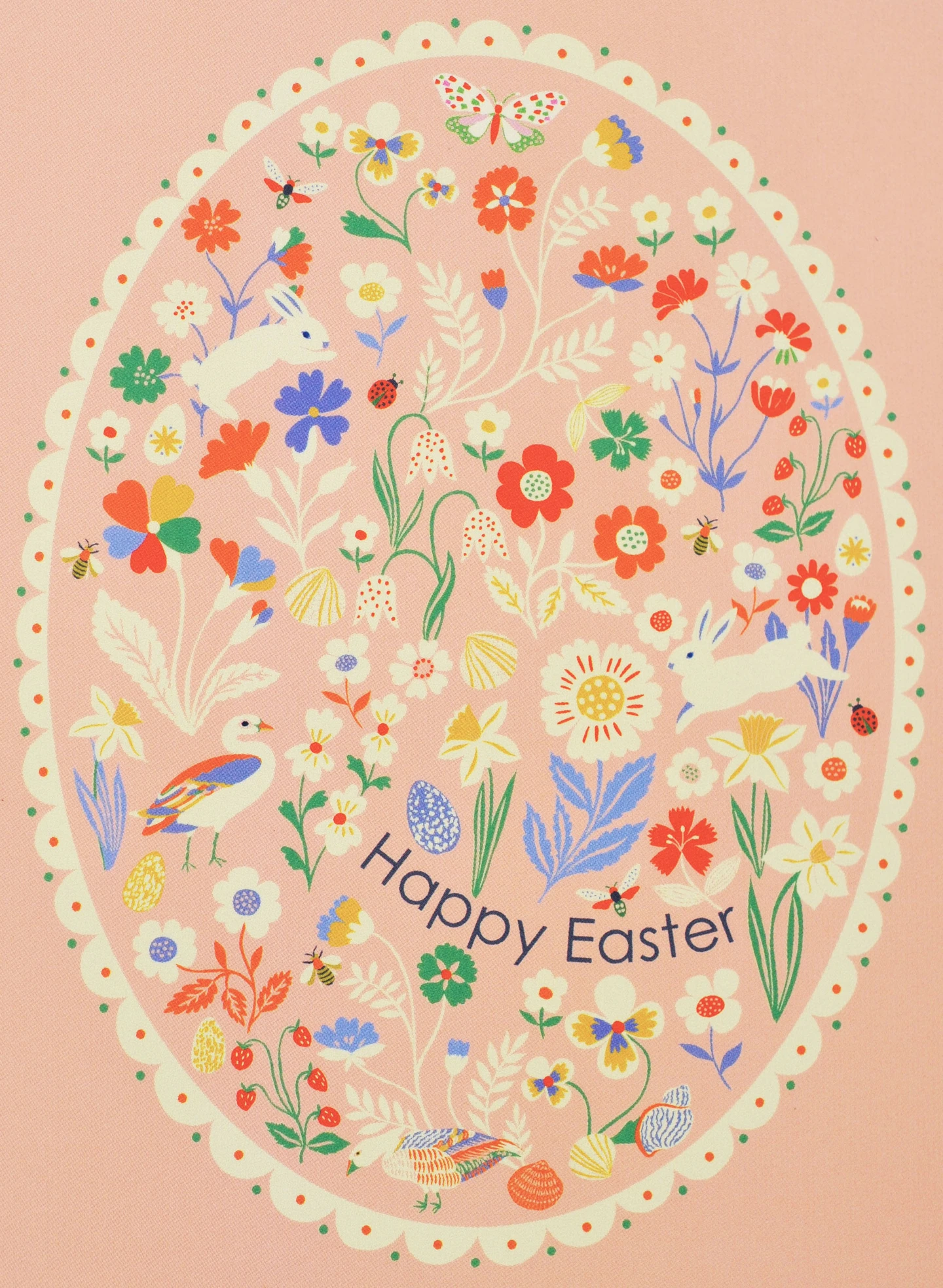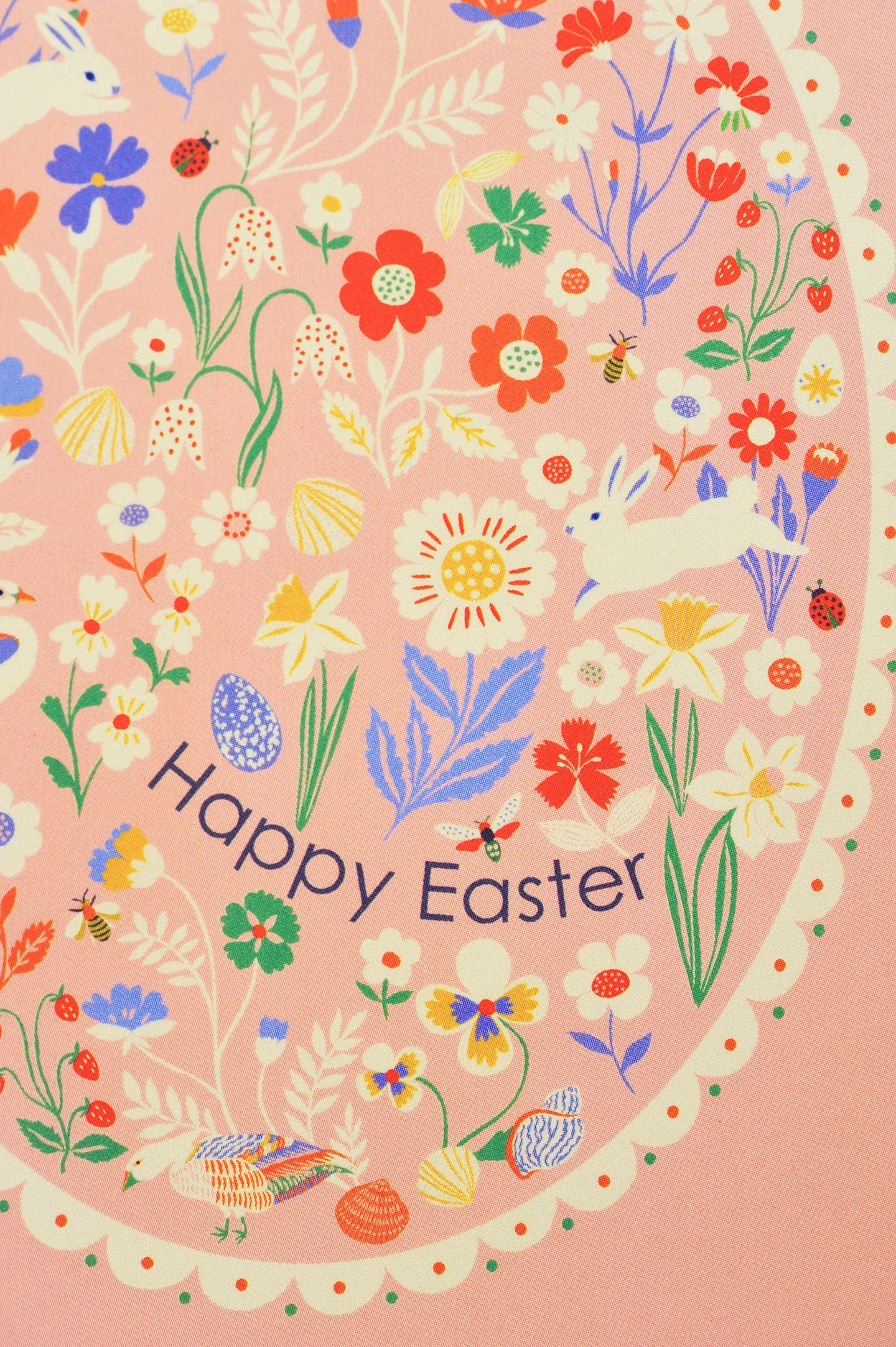 Set on a warm pinky coral background, the central floral panel feels bright, playful and full of seasonal charm. The combination of cute rabbits, tiny ducks and blooming daffodils captures the spirit of spring perfectly, making this card ideal for Easter celebrations and sending cheerful wishes.