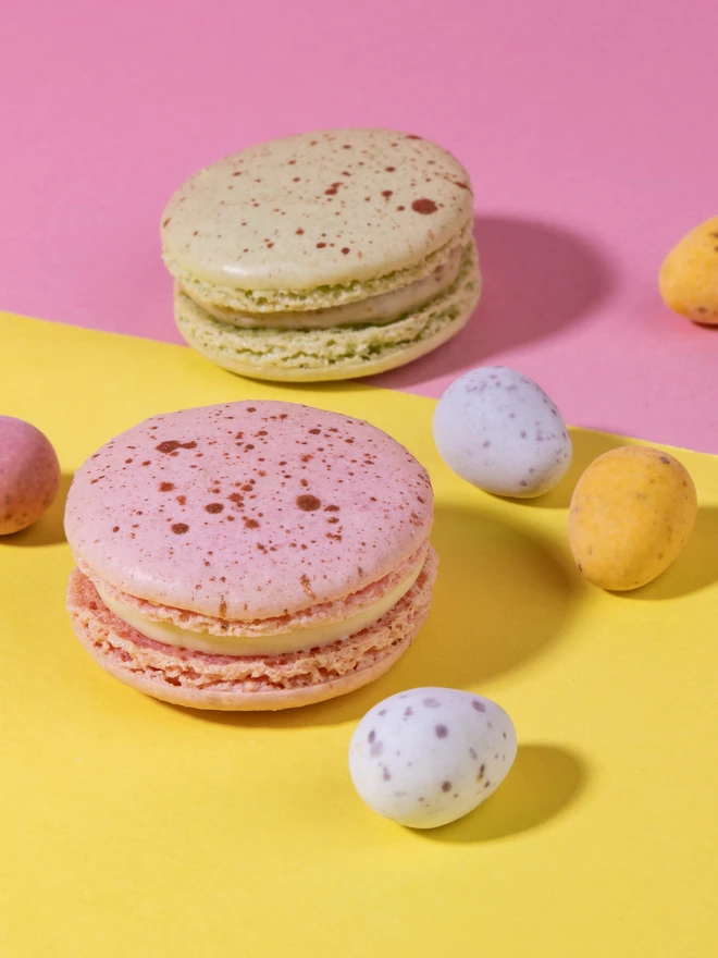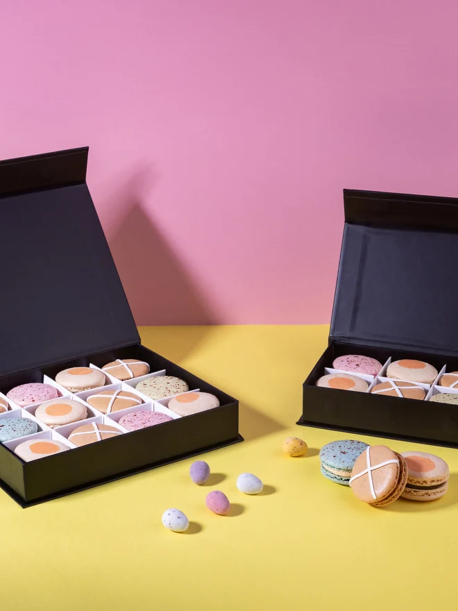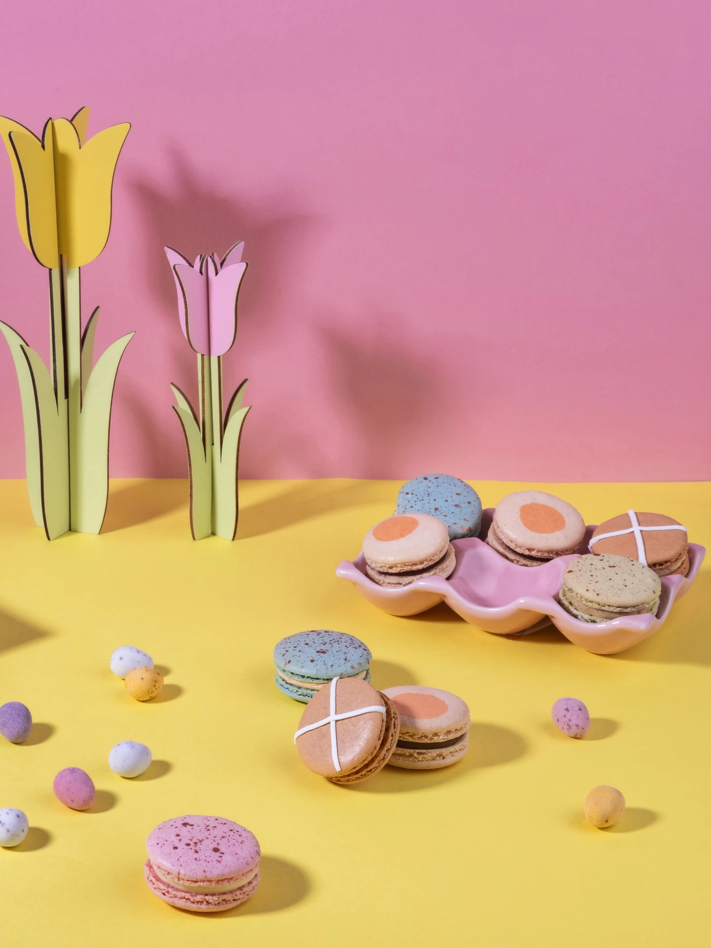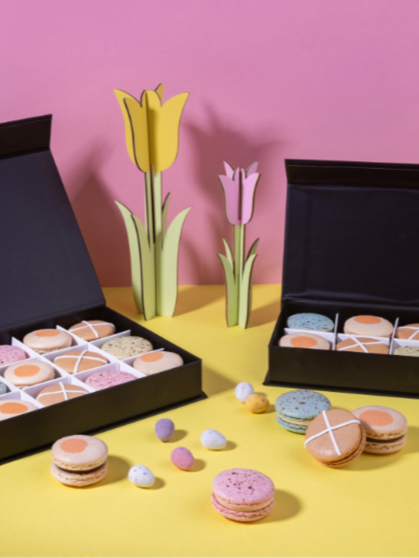 Elevate your Easter egg hunt with a box of French macarons featuring your favourite tastes of Easter 🐣