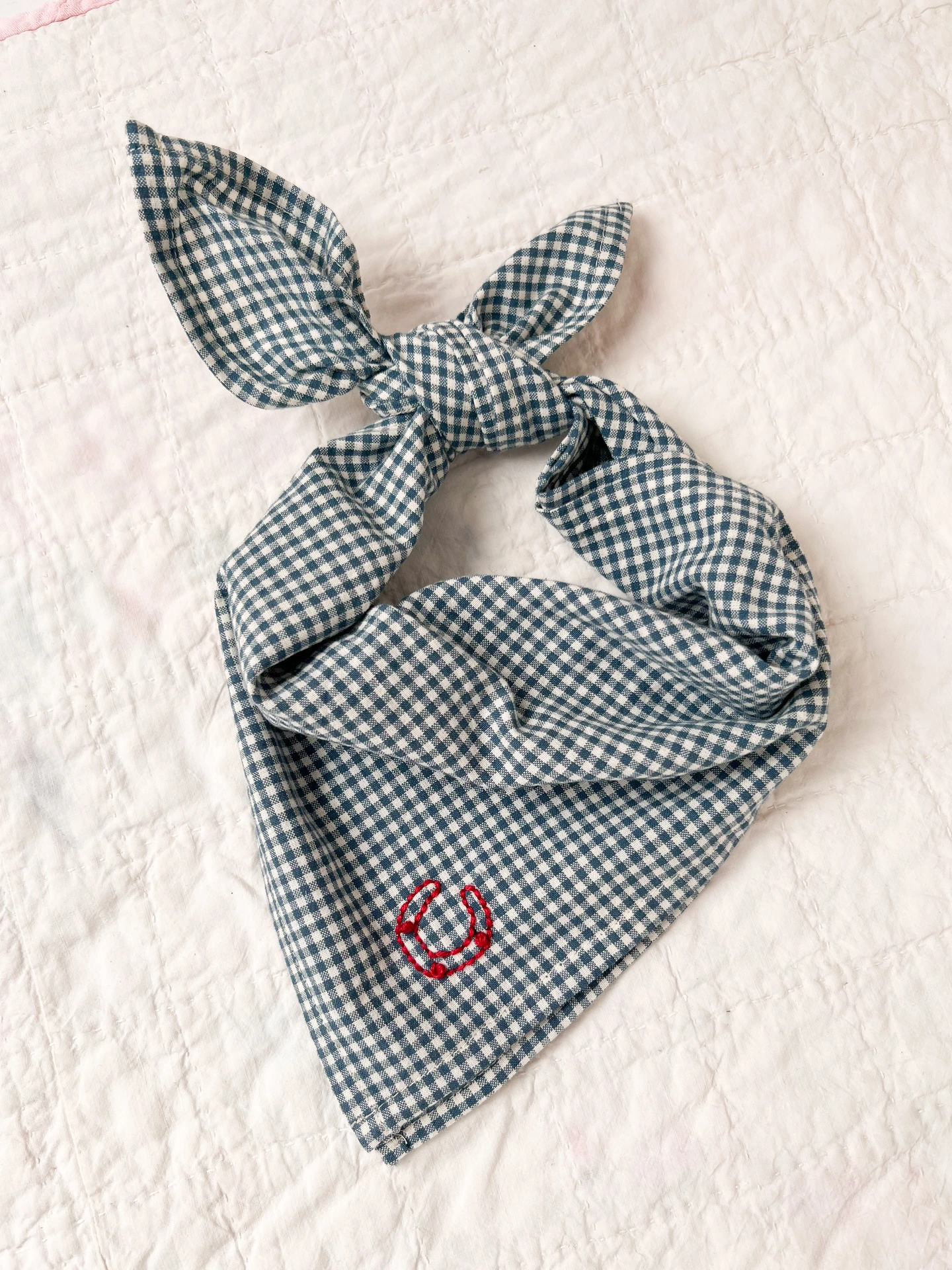 The Eddie Scarf is designed and embroidered by us from very soft cotton gingham, made to be used on the head or around the neck. The choice is yours.