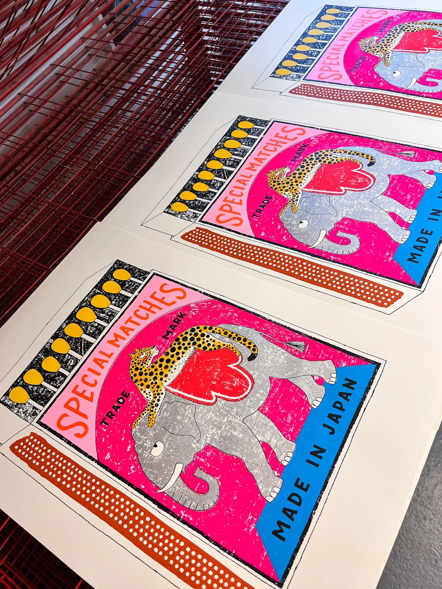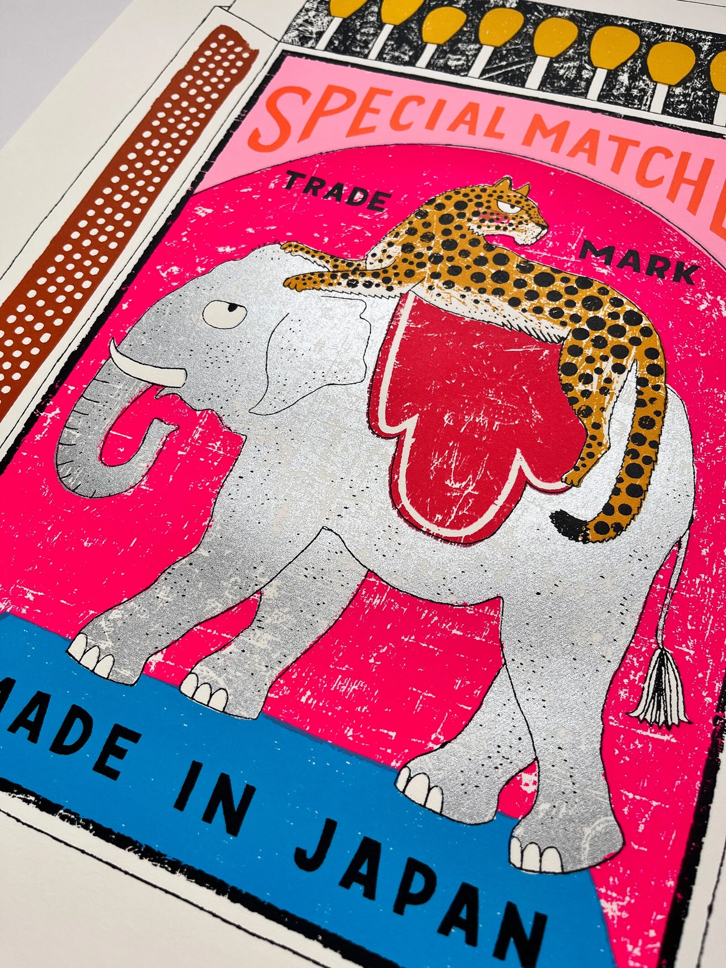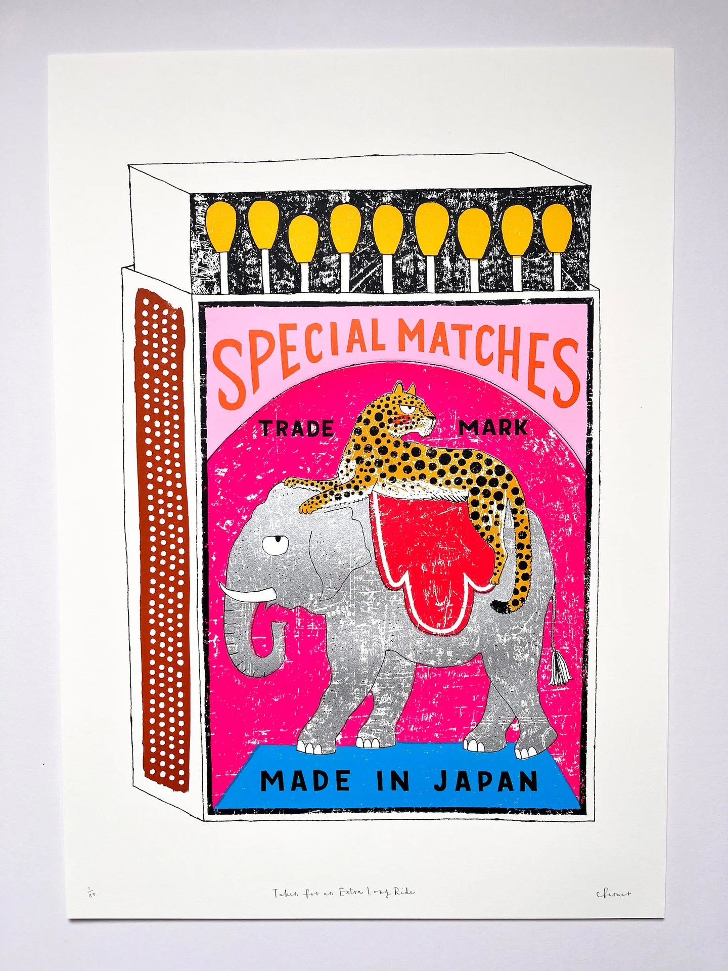 A handmade screen print of a leopard lounging on the back of a slightly bemused silver elephant - all on an illustrated matchbox.