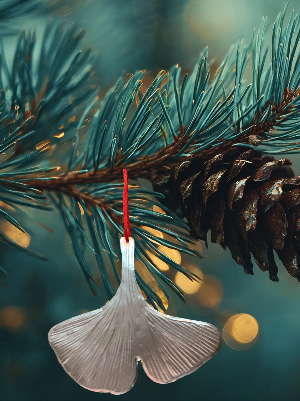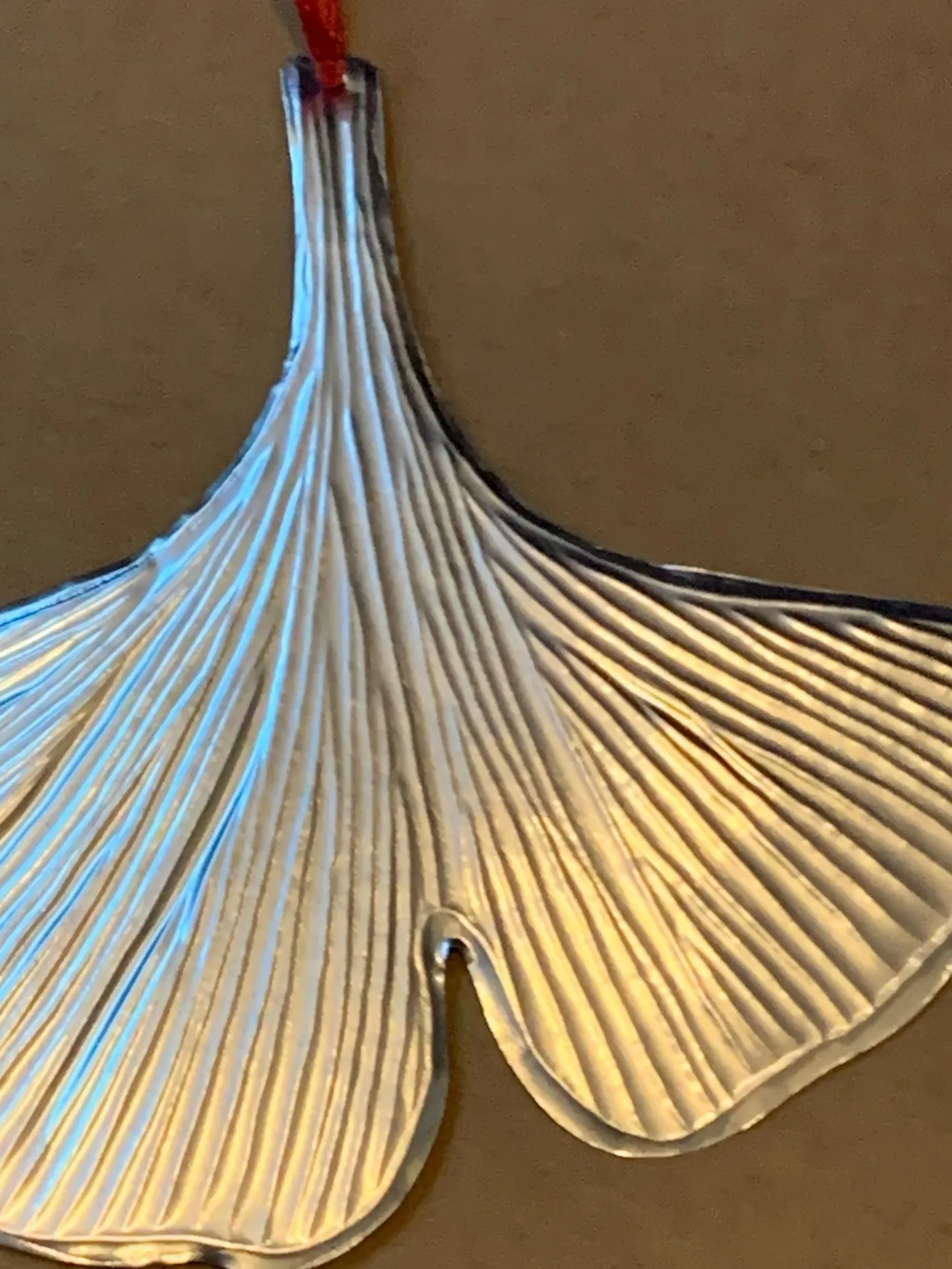 The hanging decoration, created by hand embossing tin sheet metal. This Ginko leaf design catches the light beautifully and comes on a cotton hanging string.