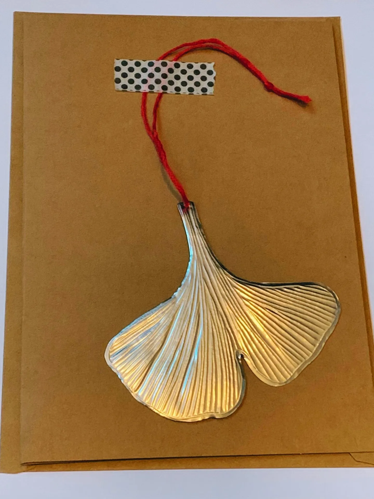 Hand-embossed tin Ginko leaf decoration, with cotton hanging string, on a kraft card, with a kraft envelope.