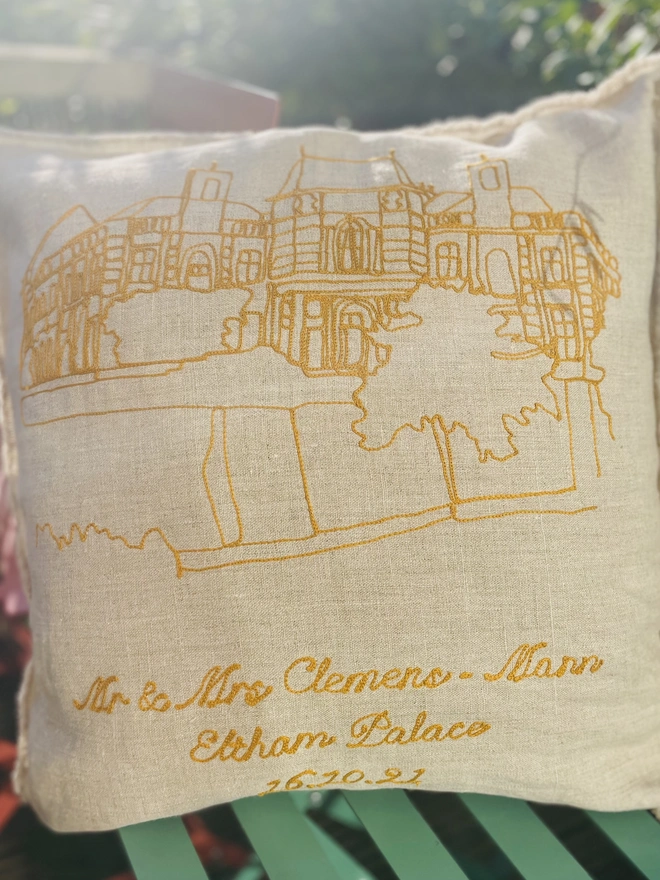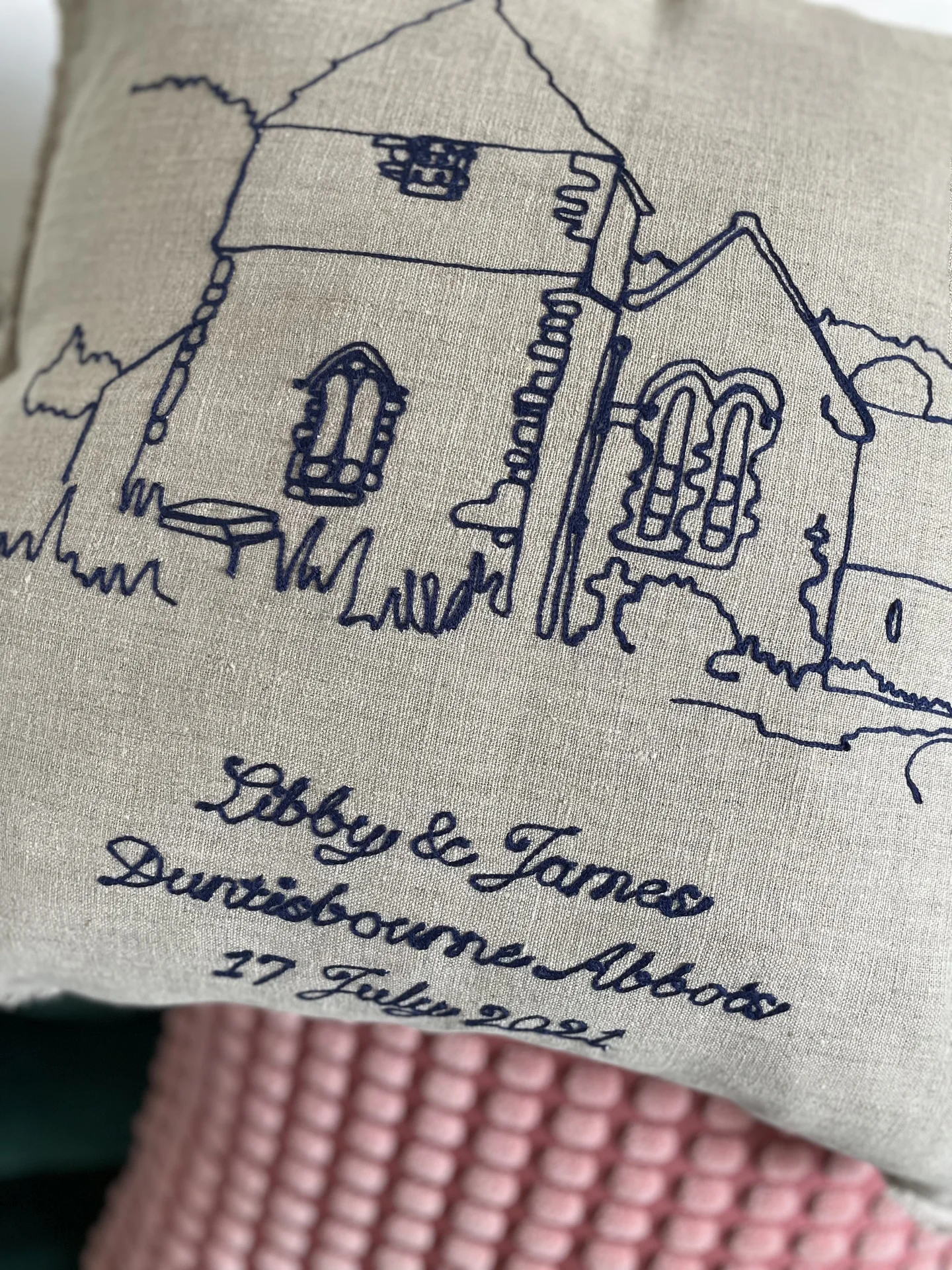 Embroidered linen cushion I can embroider your wedding venue/ home in the thread colour of your choice. I can also include names and dates.
