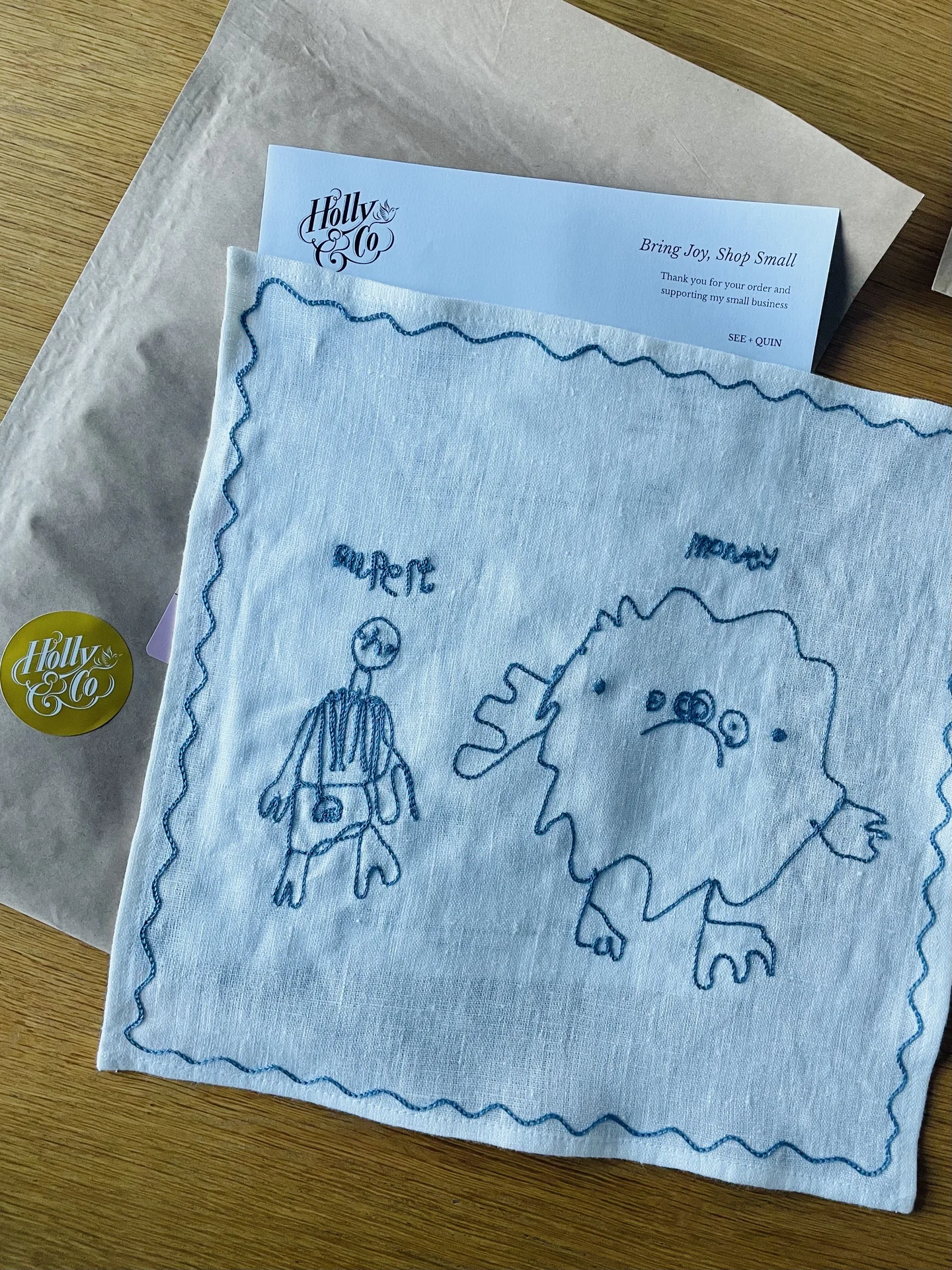 This beautiful linen handkerchief is custom embroidered with your child’s design, creating a truly personal and meaningful gift. Simply send an image of your child’s drawing. Each design is carefully traced and scaled to fit perfectly onto the handkerchief before being delicately embroidered.