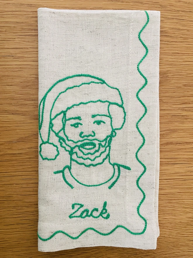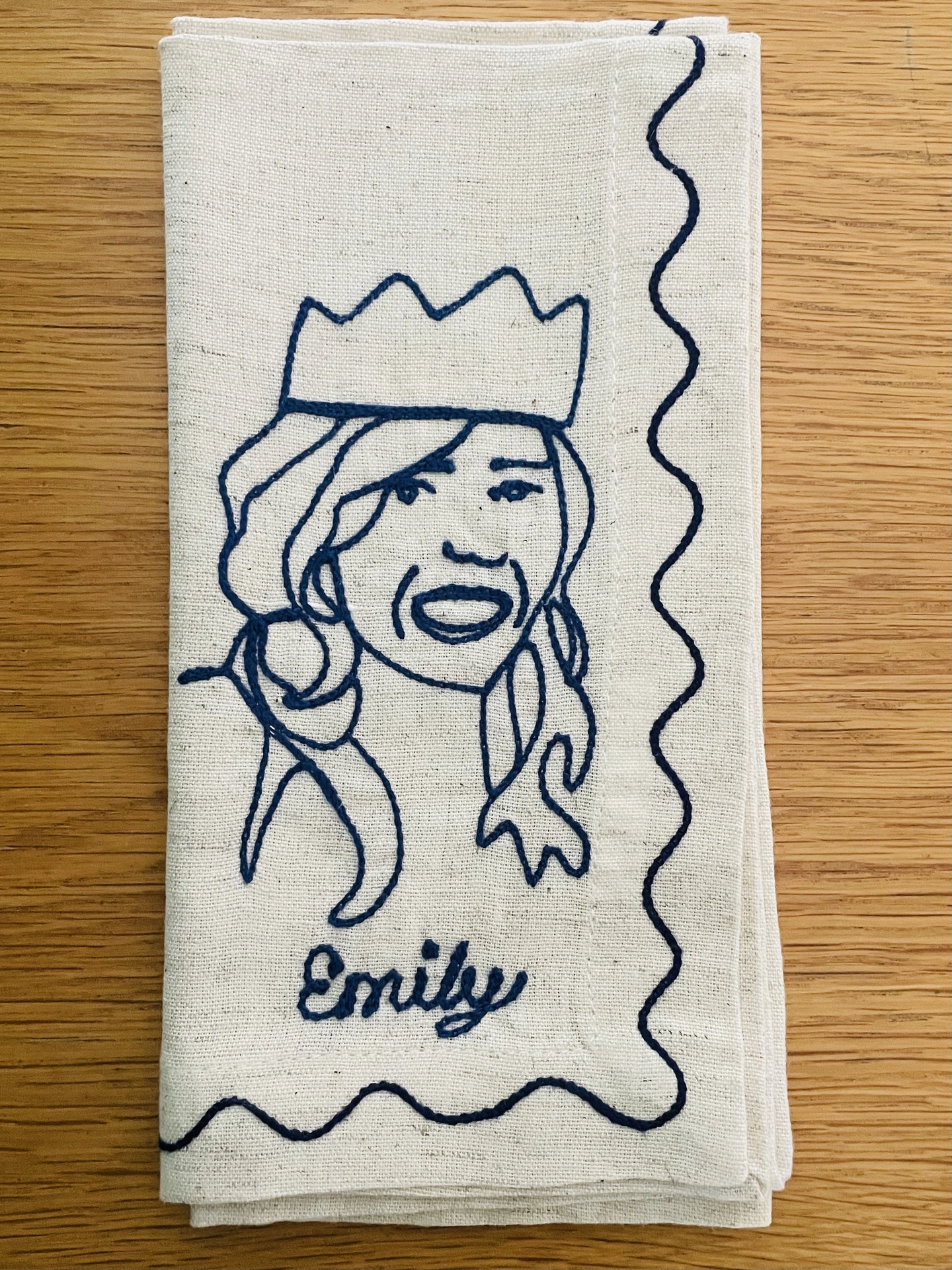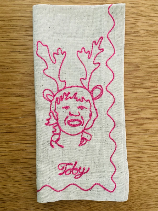 Make your Christmas or celebration unforgettable with beautifully hand-embroidered portrait napkins with a fun choice of celebration hats! Each napkin is custom-stitched with your guests’ portraits, and add a crown, santa hat or reindeer antlers,