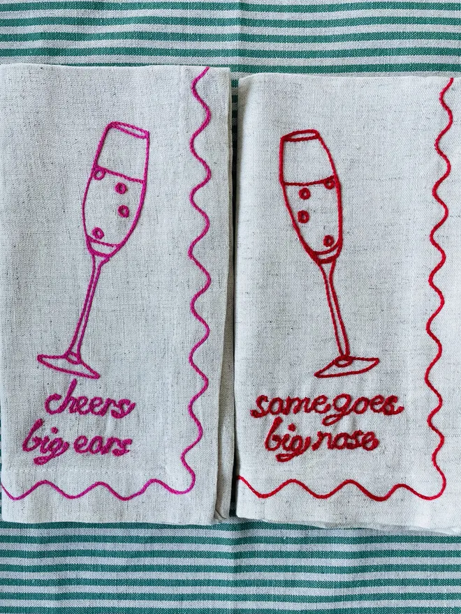 Cotton linen napkins with embroidered 'cheers big ears' & 'same goes big nose'