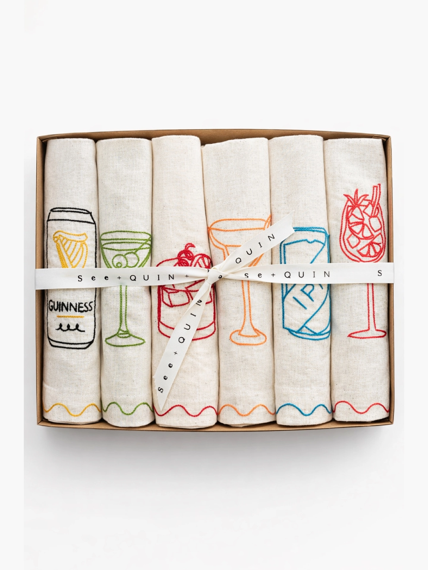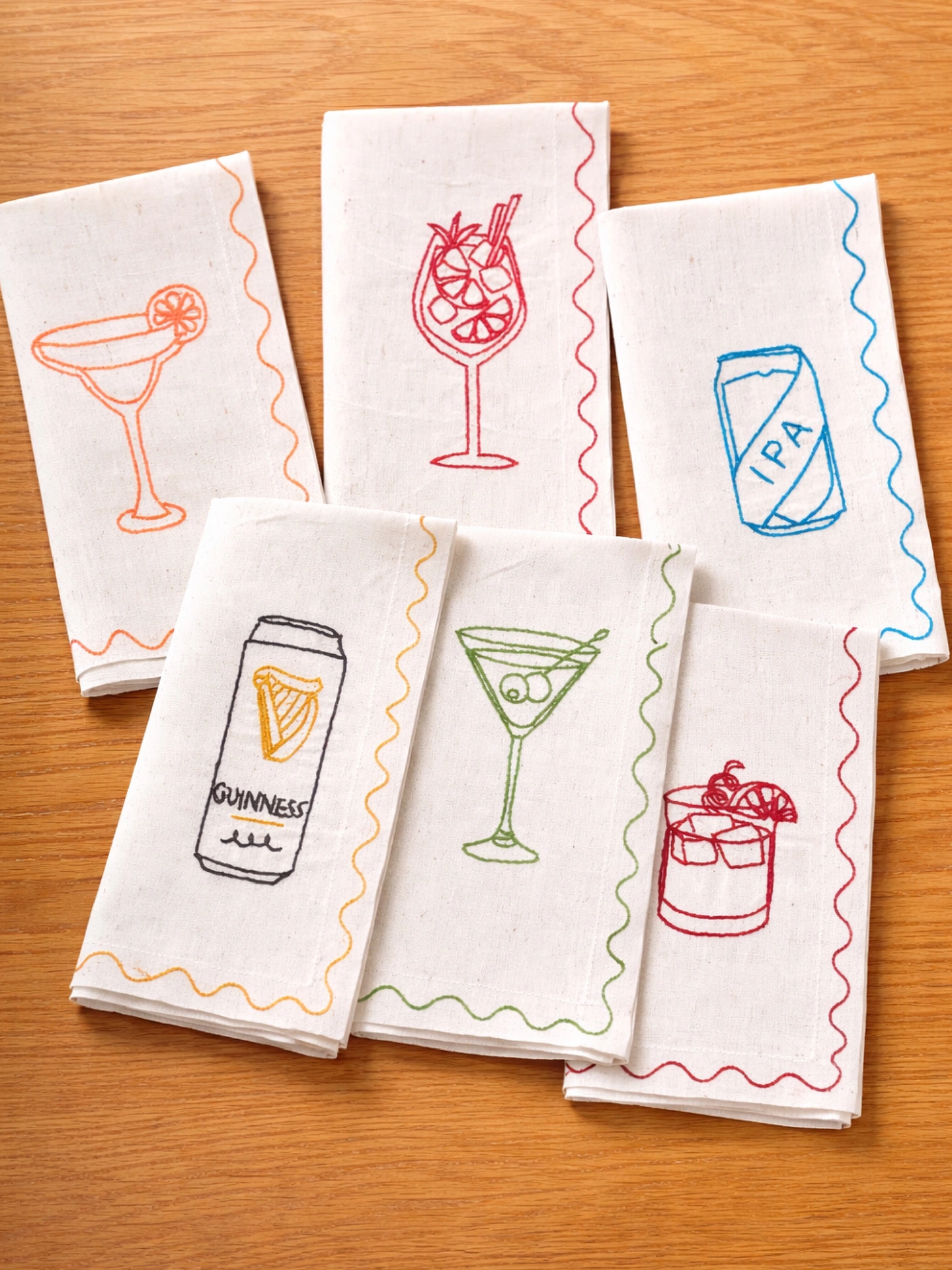 Six cotton linen napkins with embroidered cocktails.