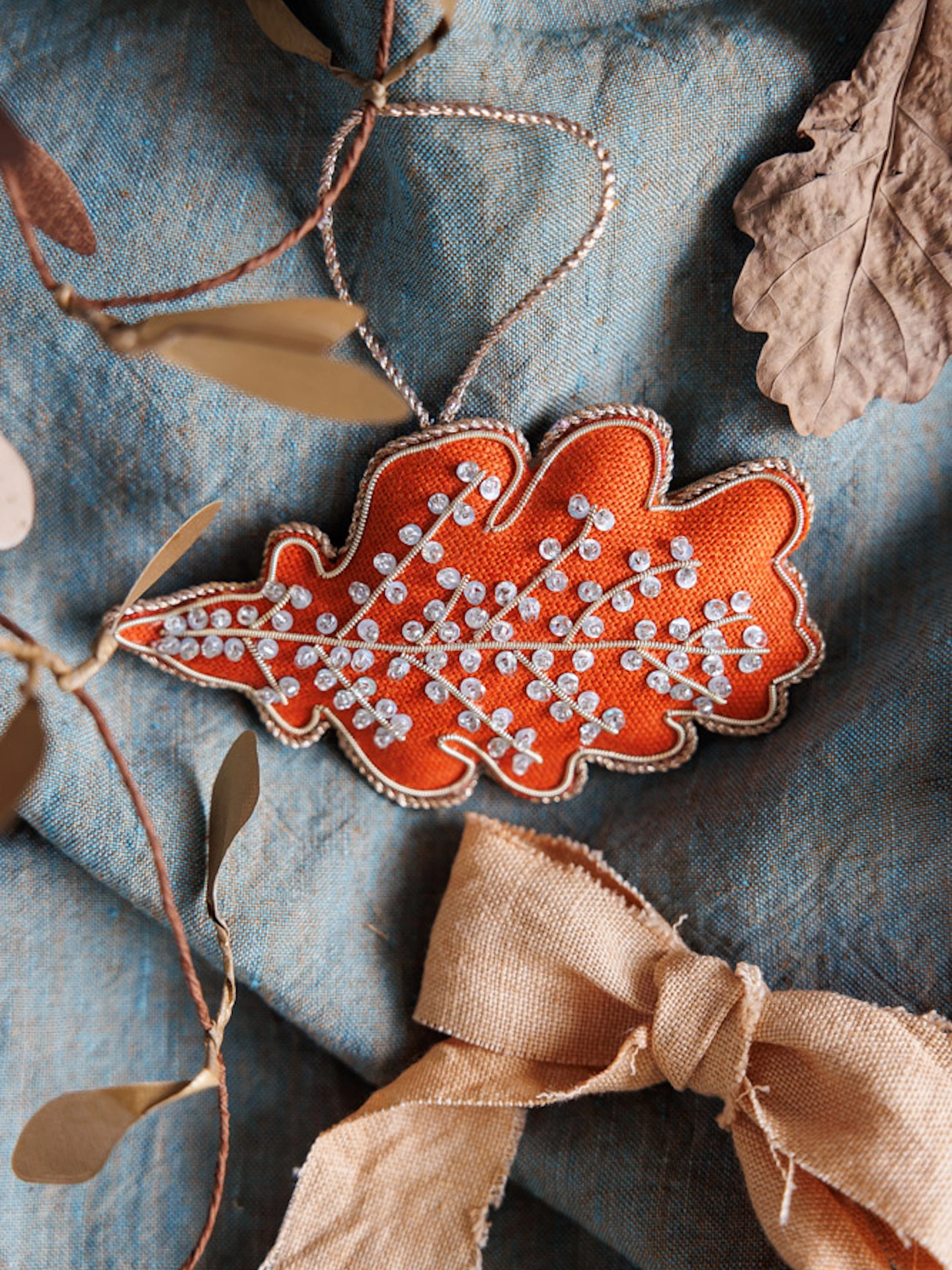 Embroidered Linen 'Oak Leaf' Decoration in Burnt Orange