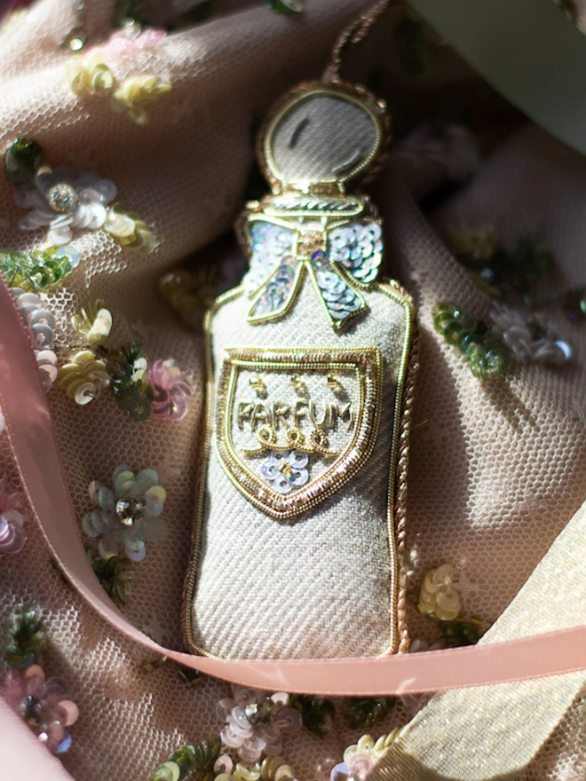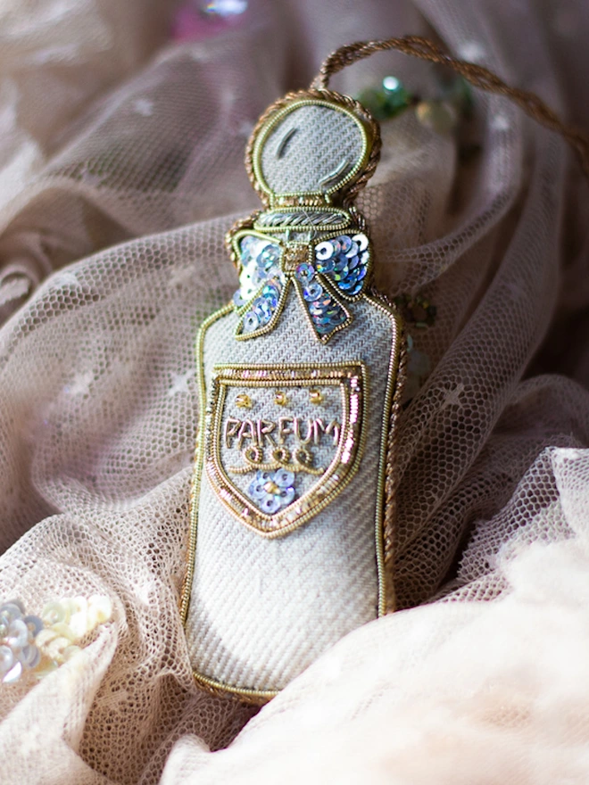 Embroidered Linen 'Parfum Perfume Bottle' Decoration