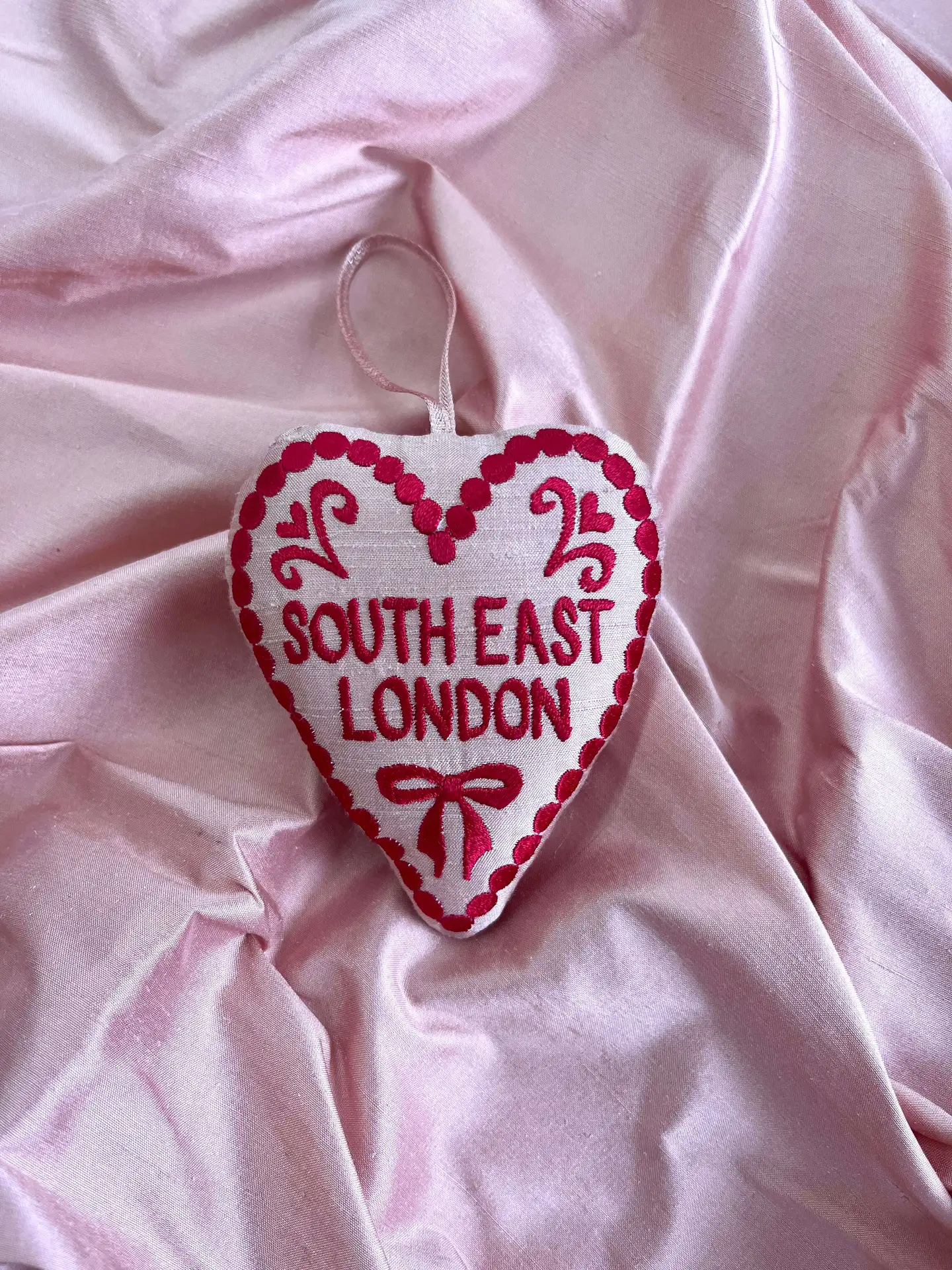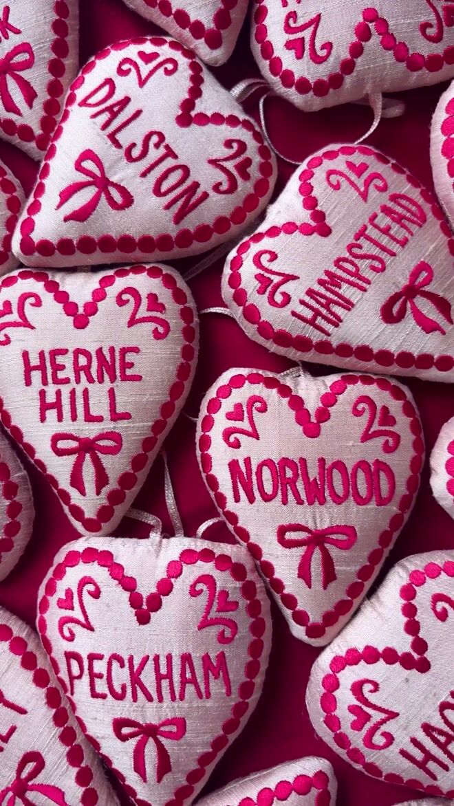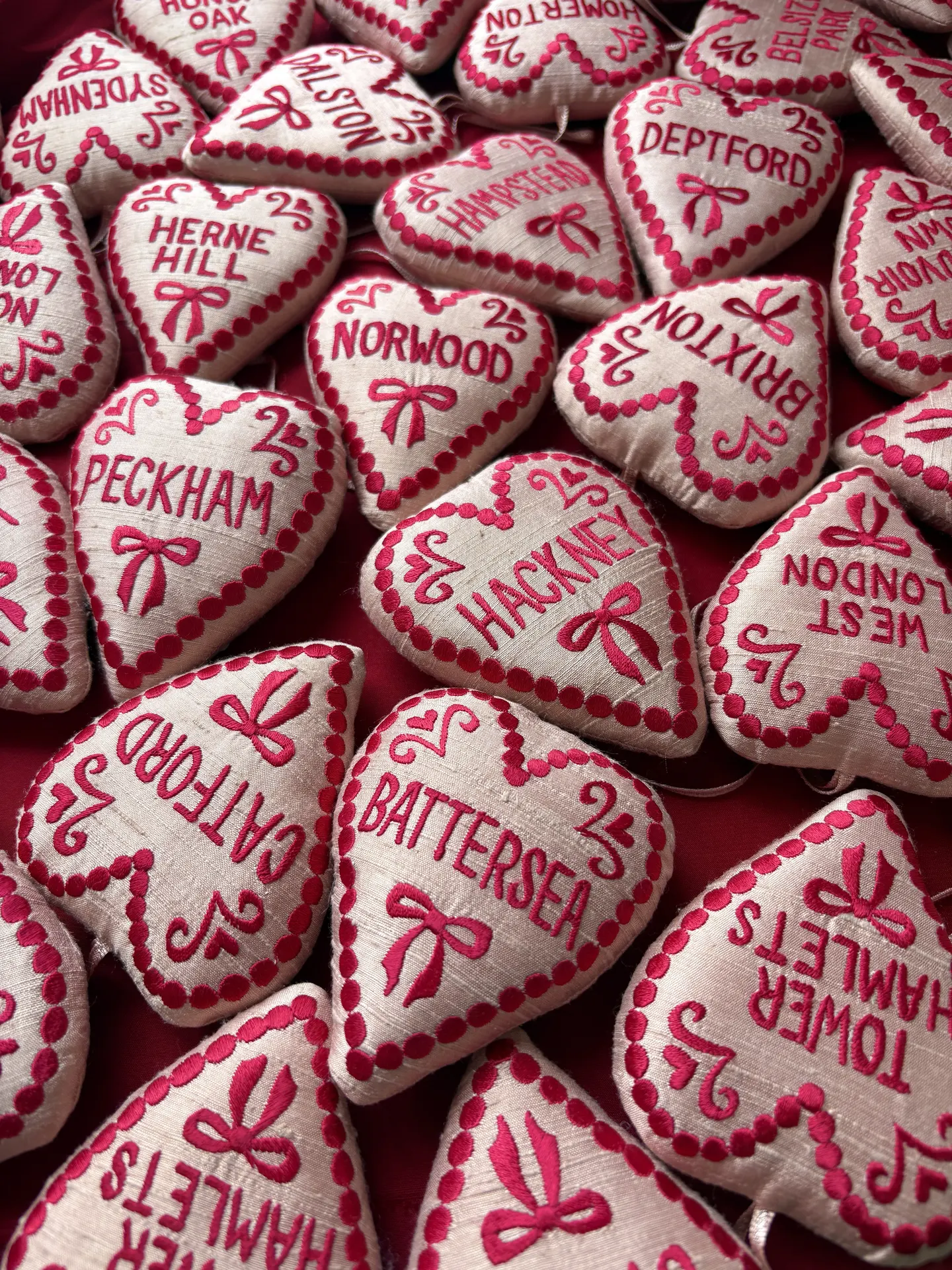 Freehand embroidered dupion silk heart ornaments for your favourite places in London!...