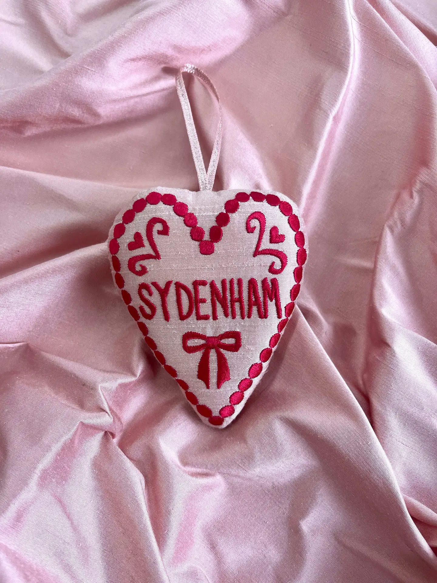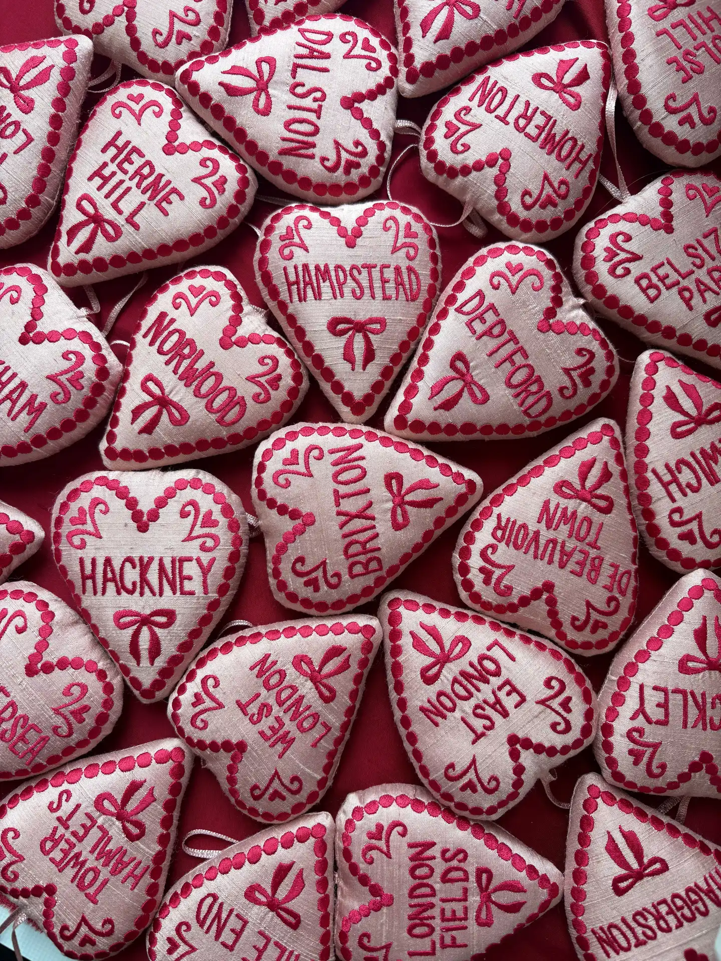 Freehand embroidered dupion silk heart ornaments for your favourite places in London!
