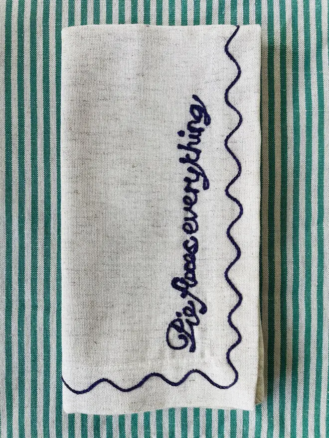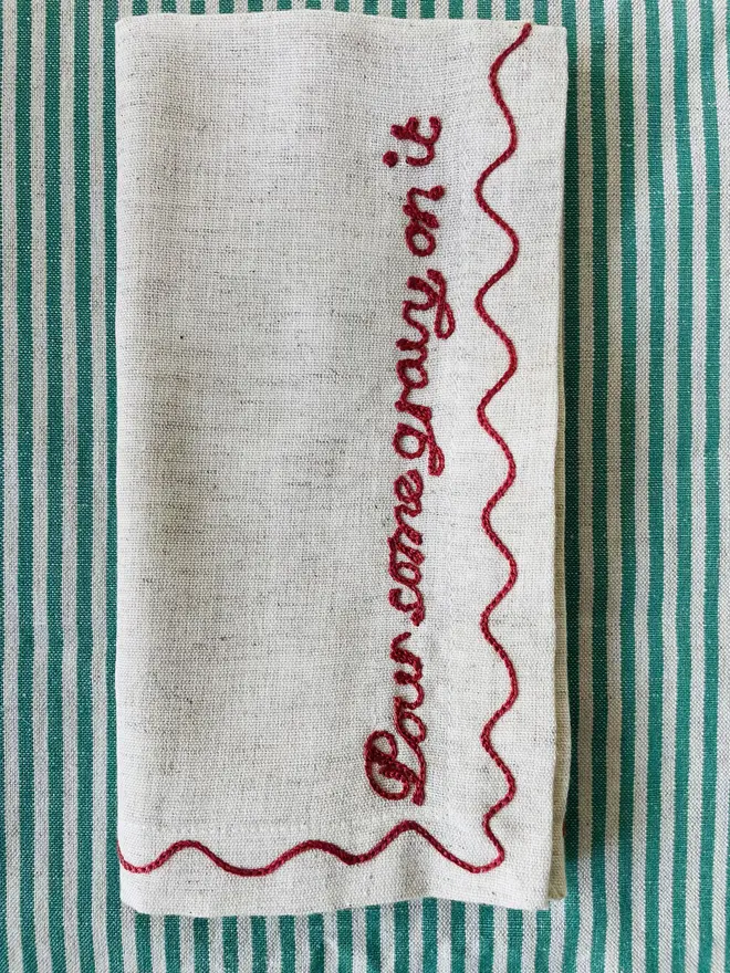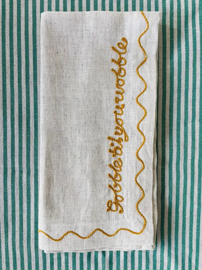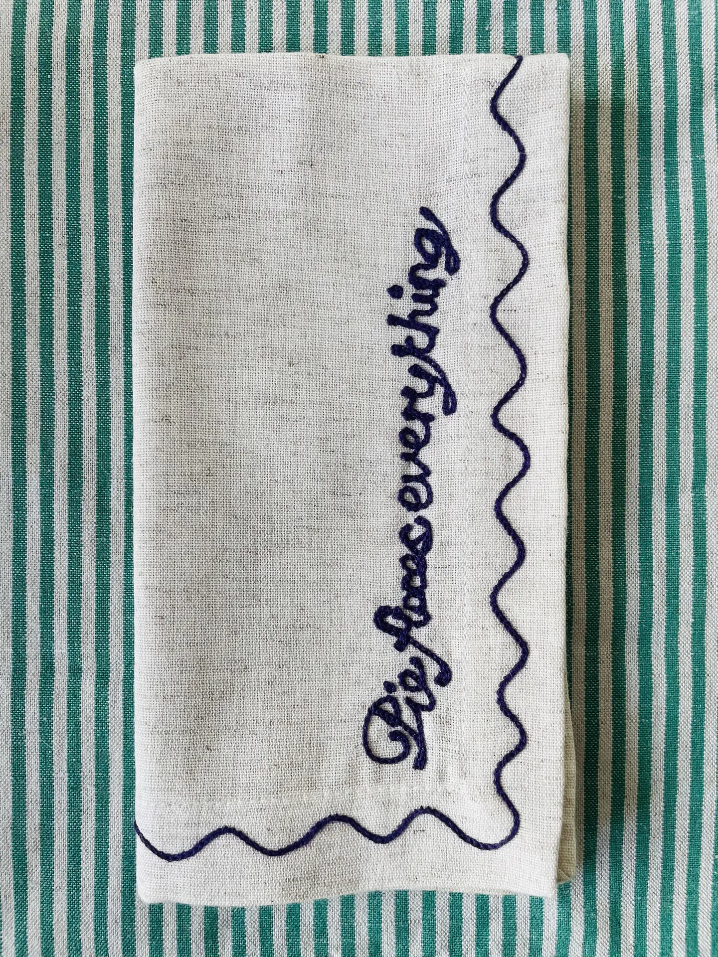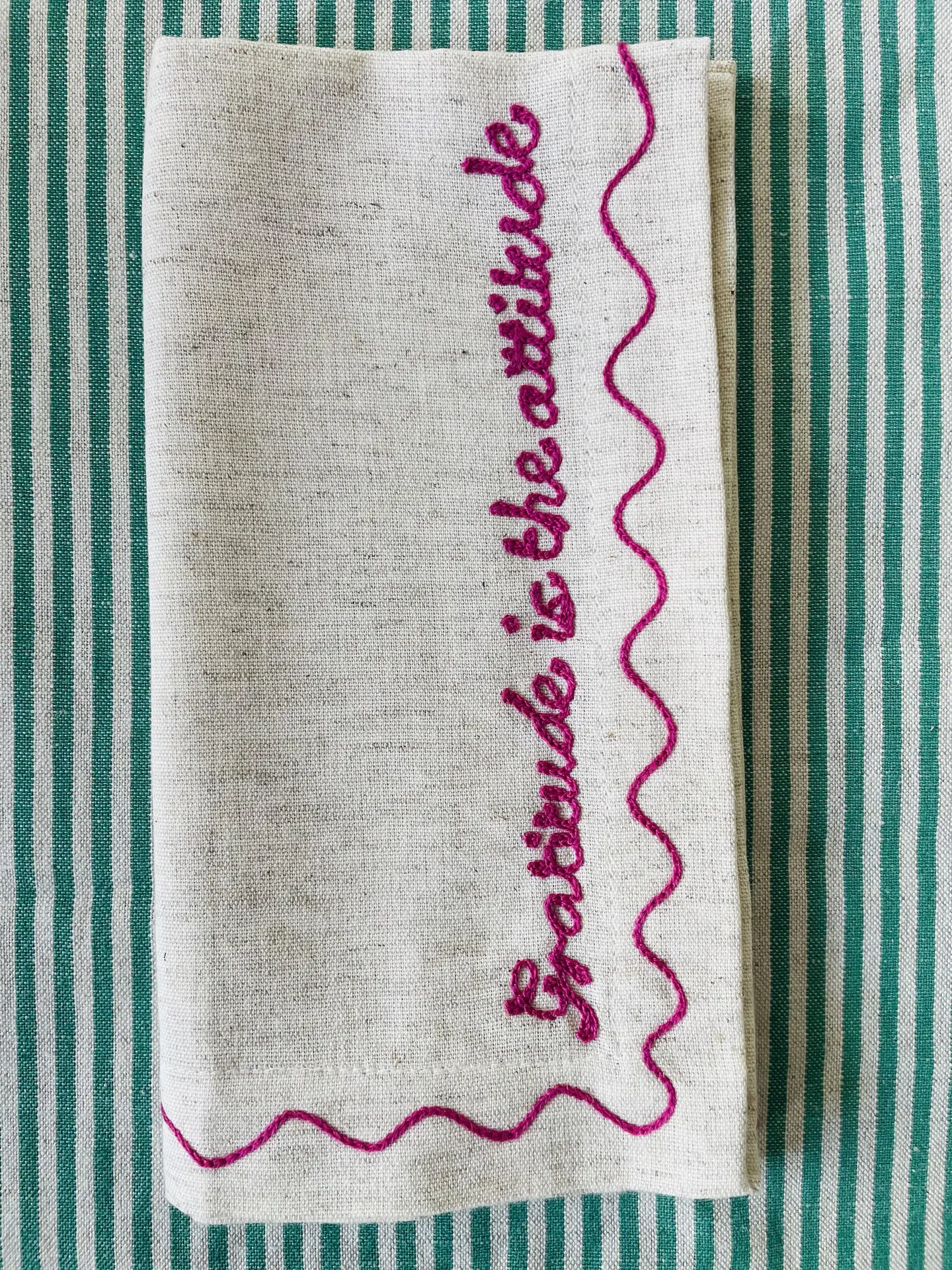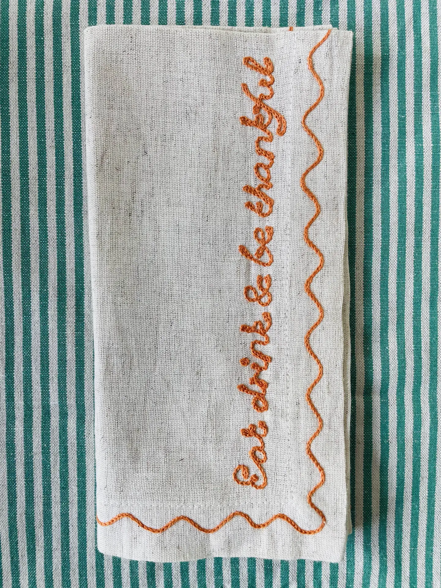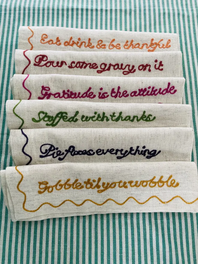 Six cotton linen napkins with embroidered Thanksgiving phrases.