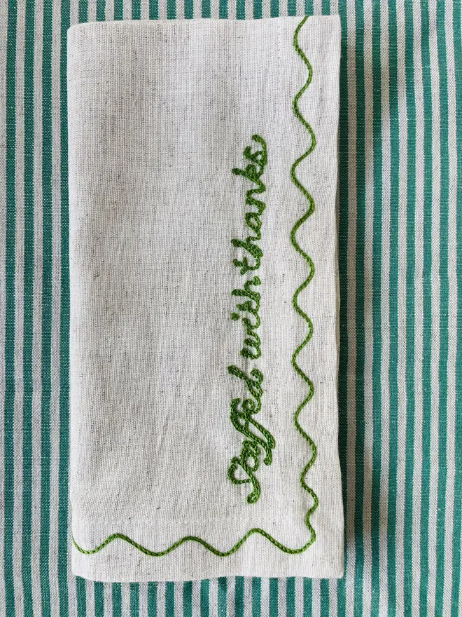 Six cotton linen napkins with embroidered Thanksgiving phrases...