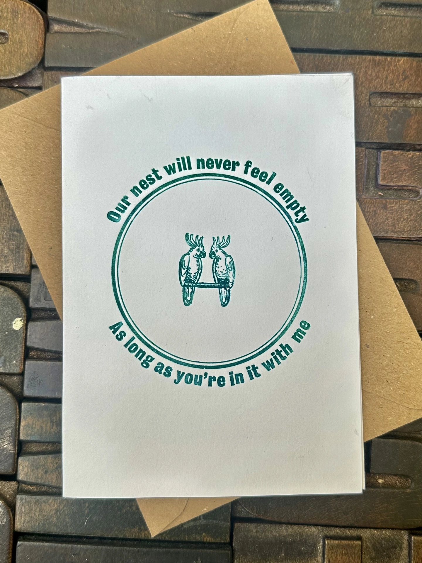 A special card for a husband, wife or partner to mark the moment when the kids have flown the nest. The cards are printed by hand using metal type and blocks on a vintage press to give that unique letterpress impression on the card.