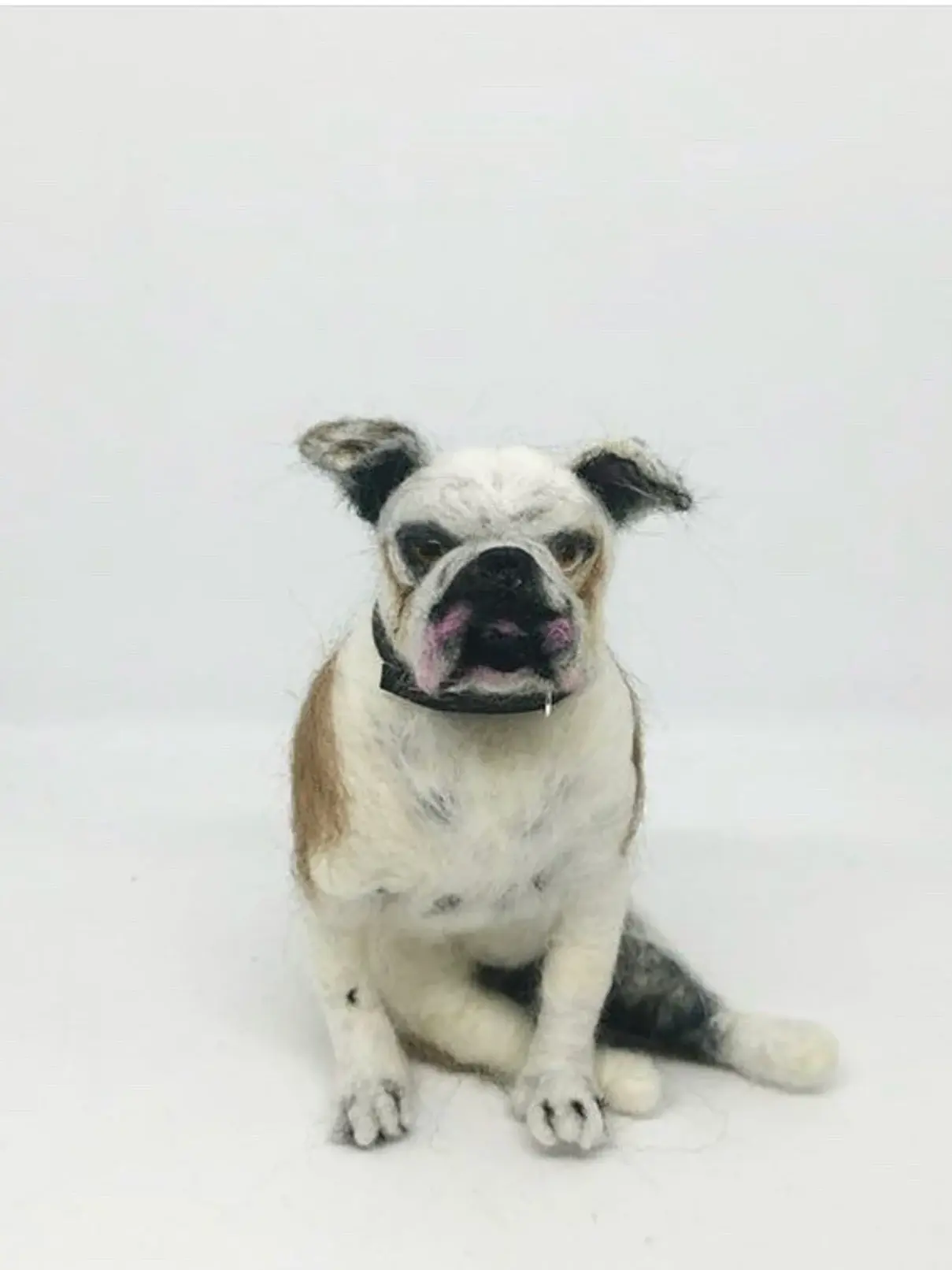 They are made completely by hand and no stuffing is used inside the miniatures. I make them using Merino wool, glass eyes and a hand made clay nose- all bespoke to your pet.